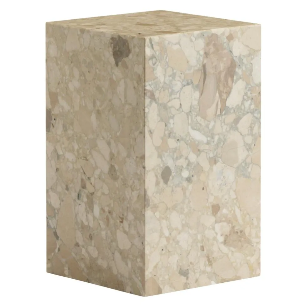 Der Name Plinth erklärt genau, wie der Plinth Tall Beistelltisch aussieht. Er bedeutet auf Deutsch nämlich Sockel. Die Oberfläche des Modells besteht aus Marmor, einem in der Baukunst seit vielen Jahrtausenden eingesetzten Material. Schon die alten Griechen und Römer wussten es wegen seiner Robustheit und der einzigartigen Marmorierung zu schätzen. Das Naturmaterial ist von zufälligen Adern durchzogen, was jeden Plinth Tall Beistelltisch einzigartig macht. Im Inneren des Tisches verbirgt sich eine Konstruktion aus Holz, die Bodenplatte ist aus MDF gemacht. Darunter sind Gleiter befestigt, die heikle Böden schonen. An fünf Seiten des Plinth Tall Beistelltisches sind 2 cm dicke Marmorplatten befestigt. Es gibt den Plinth Tall Beistelltisch in unterschiedlichen Farbtönen.