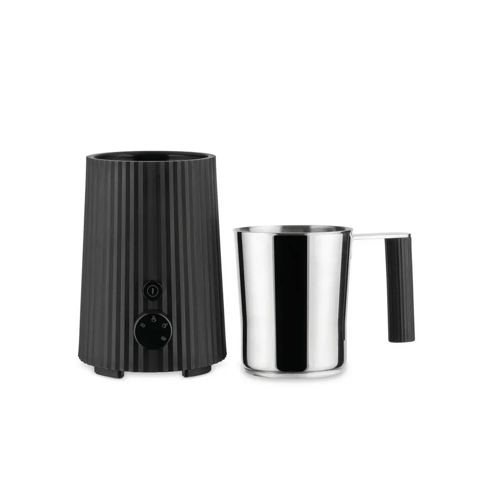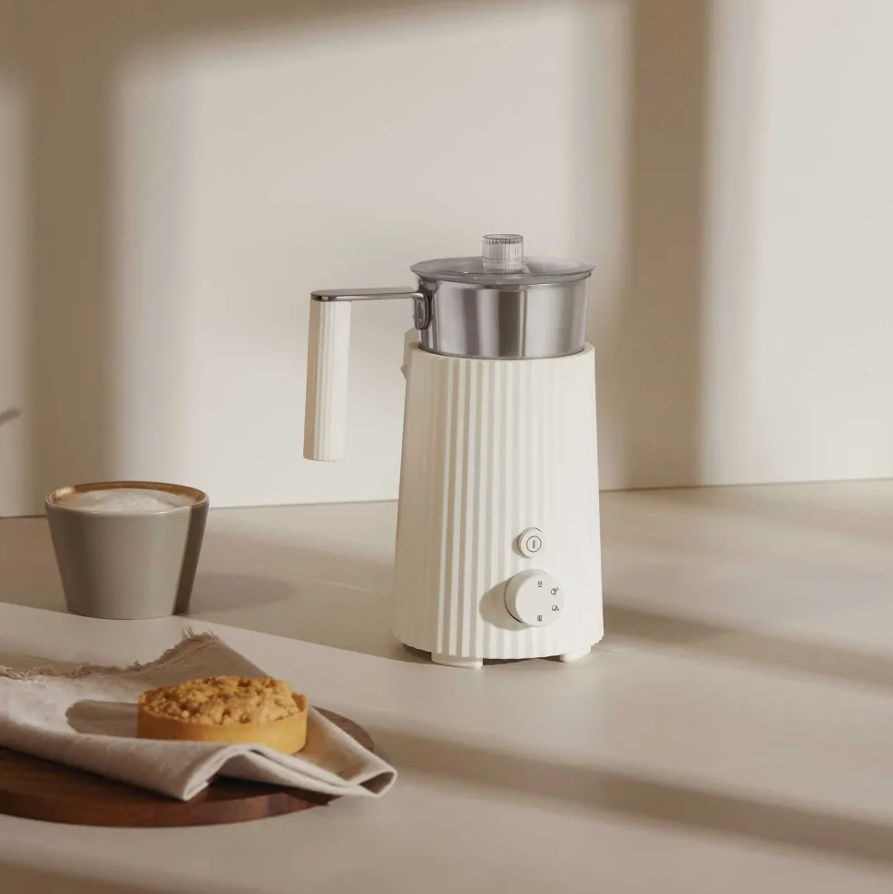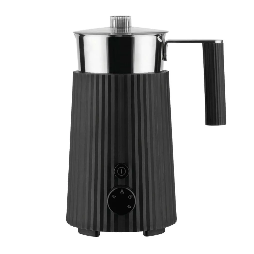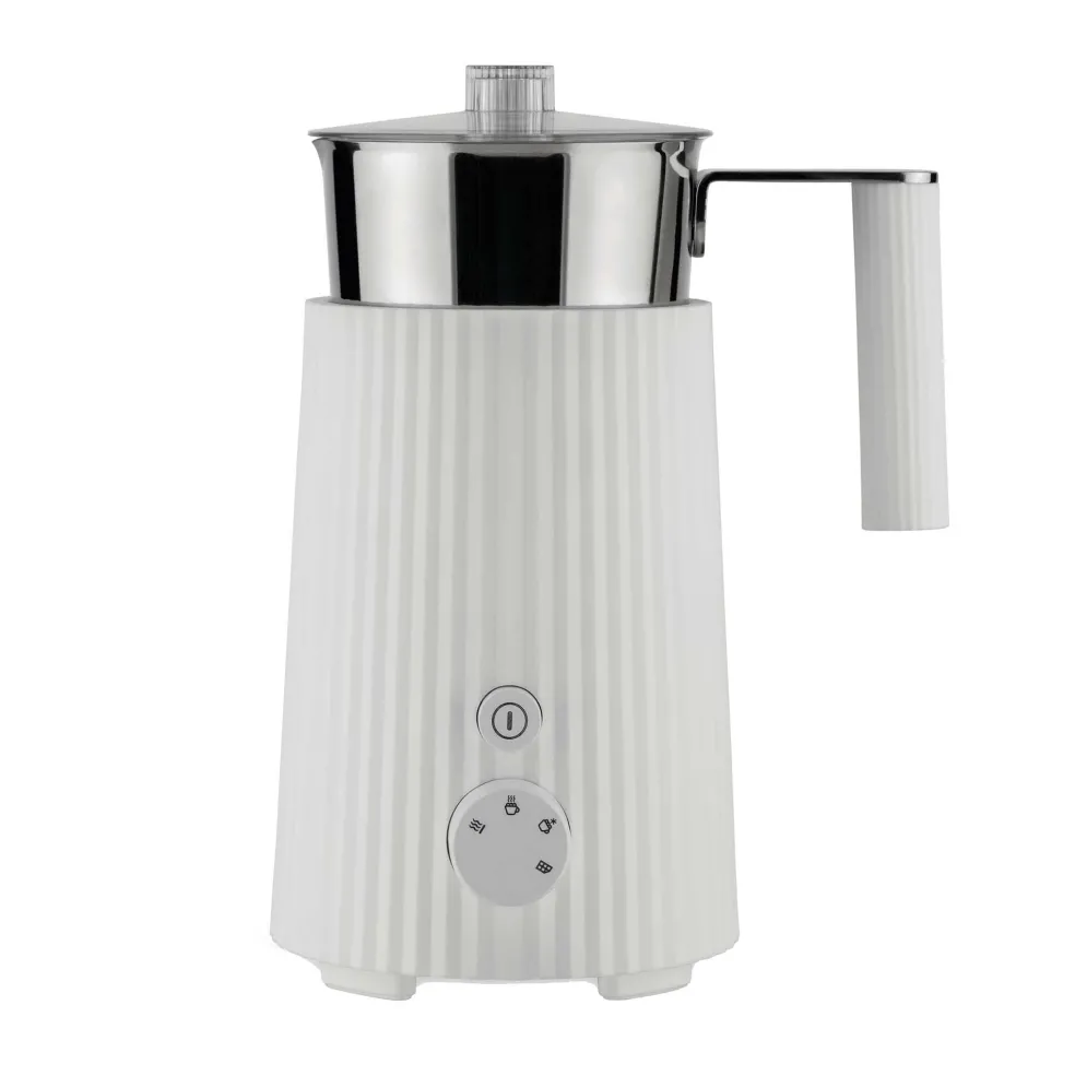 Der Plissé Milchaufschäumer gehört zu einer eleganten Serie an Kleingeräten, die auch Isolierkannen, Wasserkocher und Toaster umfasst. Der italienische Designer entwarf die Kollektion als Hommage an edle Plissee-Stoffe, die in der Mode viel Beachtung finden. Das Gehäuse und der Griff bestehen aus thermoplastischem Harz in Faltenoptik. Im Inneren verbirgt sich eine Kanne aus Edelstahl. Da man sie entnehmen kann, wird die Reinigung des Plissé Milchaufschäumers zum Kinderspiel. Der Deckel wird aus ABS-Kunststoff gefertigt. Der Plissé Milchaufschäumer hat ein Fassungsvermögen von 350 ml. Die Leistung beträgt 600 W. An der Vorderseite befinden sich ein Schalter und ein Drehknopf für verschiedene Stufen. So lässt sich wahlweise kalter oder auch warmer Milchschaum herstellen.