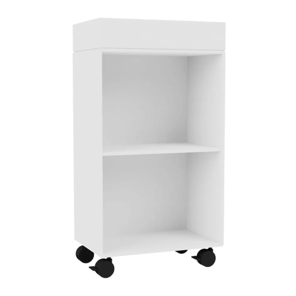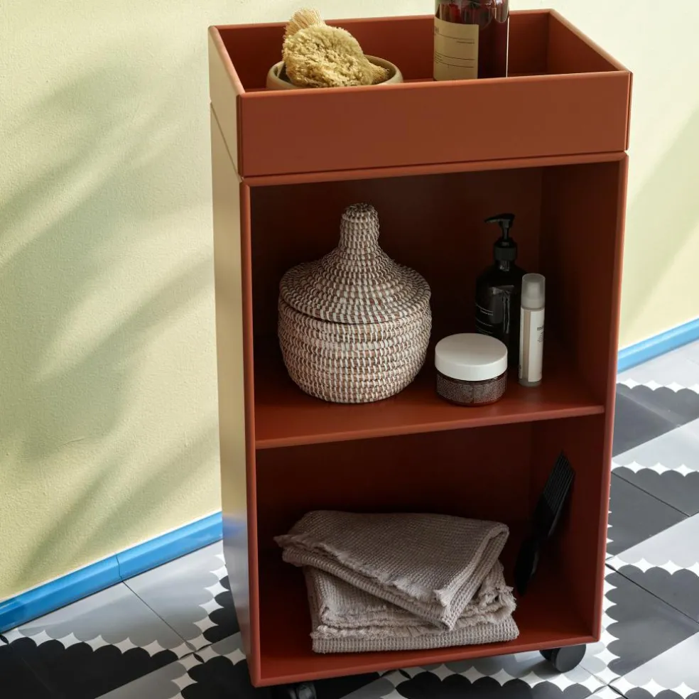 Seine zwei offenen Fächer und die praktische Ablagebox als Abdeckung machen dieses Aufbewahrungsmöbel zu einem formschönen wie funktionalen Regal. Dank seiner Rollen lässt es sich einfach an die gewünschte Position schieben. Hergestellt aus schlanken MDF-Platten und mit einem wasserfesten Lack behandelt, behält der Preppy Rollwagen auch in feuchten Umgebungen lange sein hochwertiges Aussehen. Seine Regalfächer sind perfekt für die Aufbewahrung von Handtüchern, Fläschchen und Tuben für Wellnessprodukte. Die hohen Ränder der Ablage an der Oberseite verhindern, dass abgelegte Kleinteile nicht über die Kanten des Wagens rutschen. Mit dem Europäischen Umweltzeichen zertifiziert. ist das Designmöbel eine nachhaltige Wahl für einen umweltbewussten Haushalt. Es eignet sich nicht nur für das Badezimmer daheim, sondern auch für die Nassbereiche von Hotels oder Restaurants.