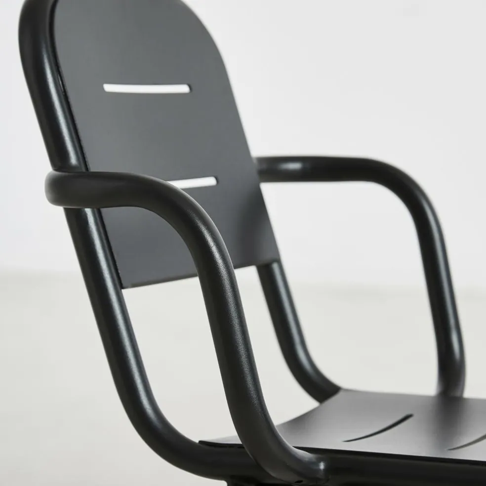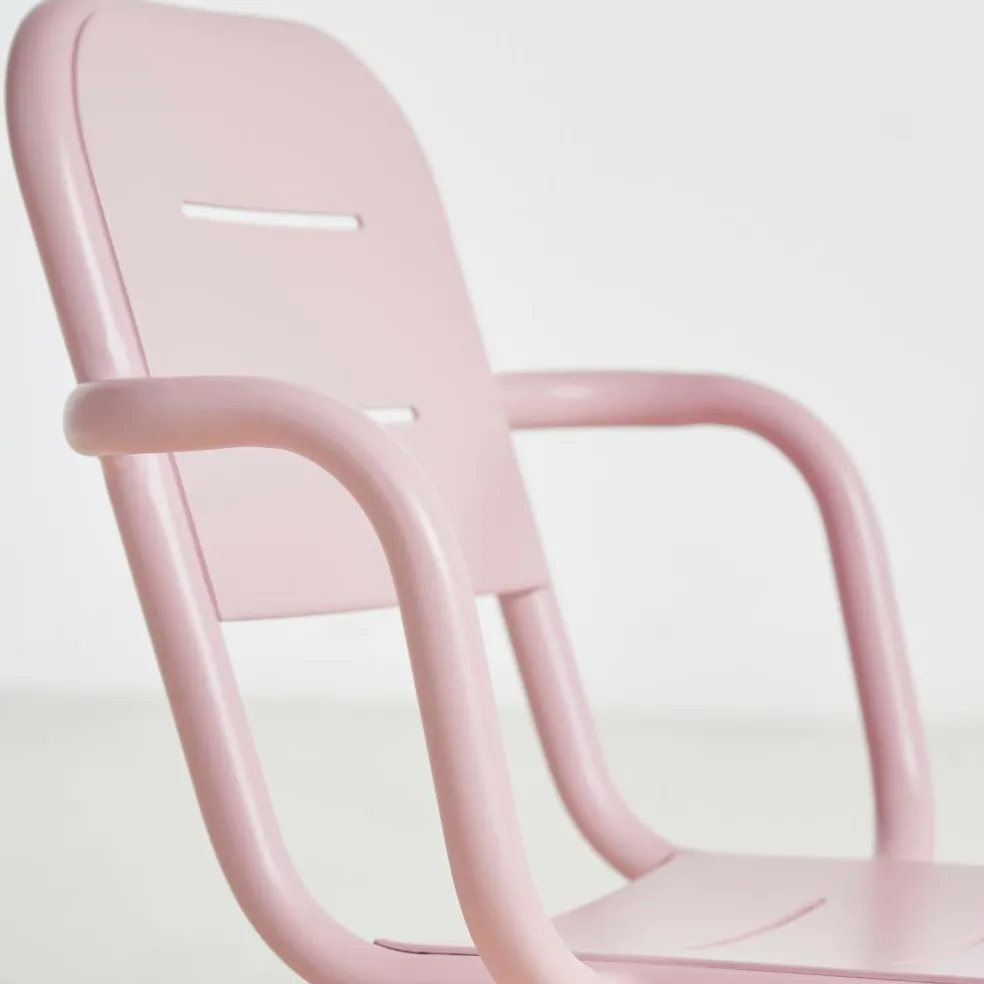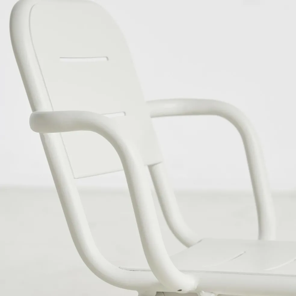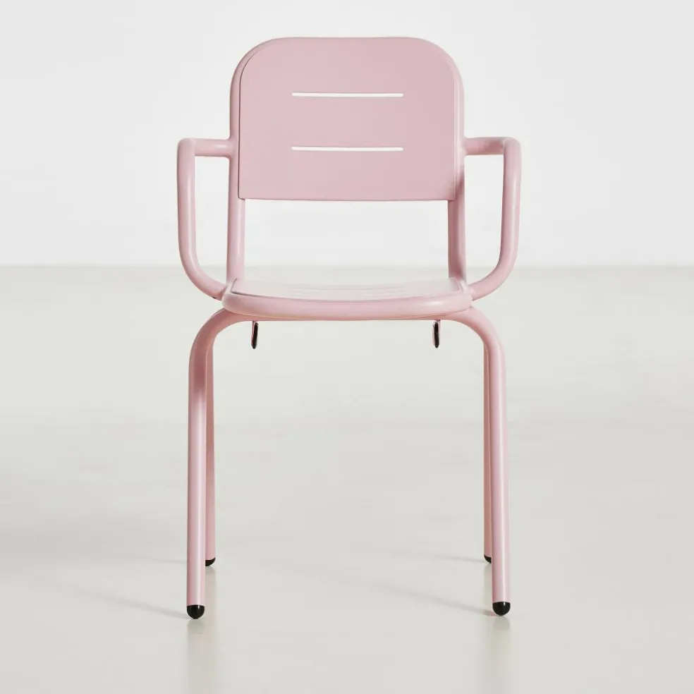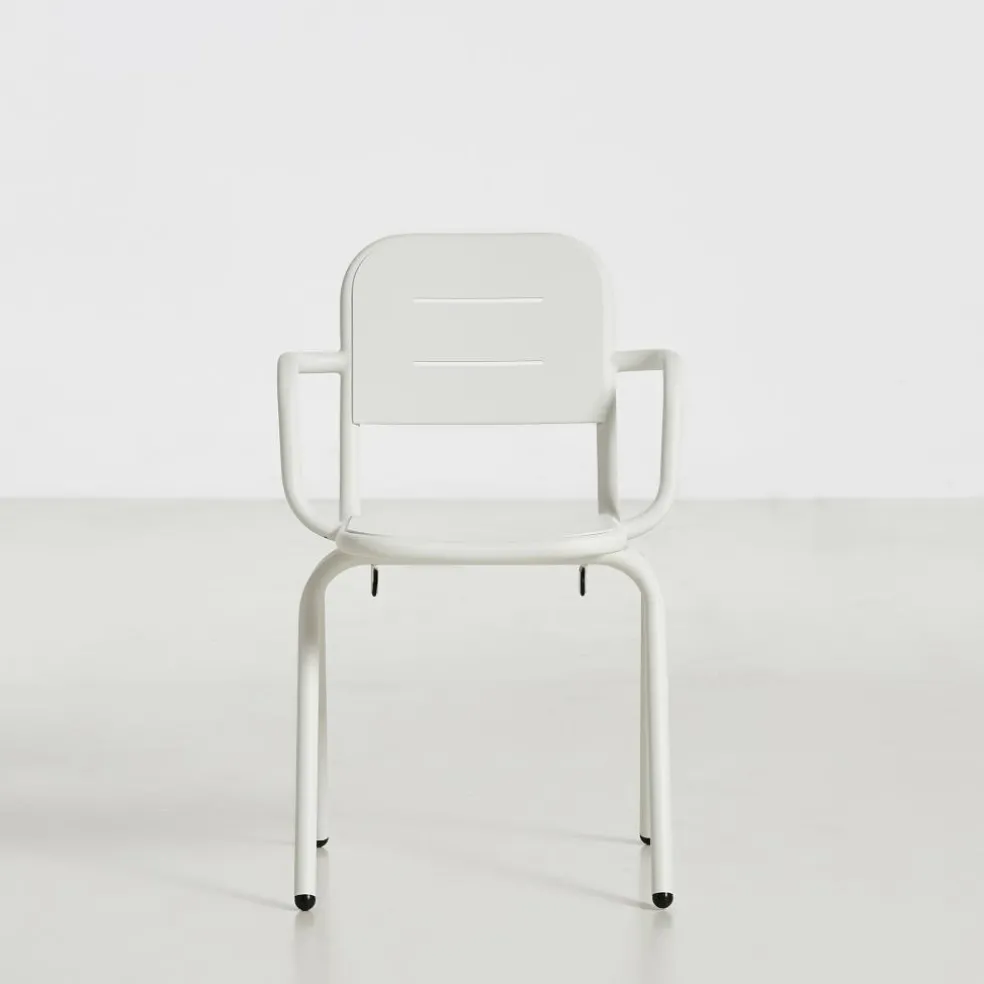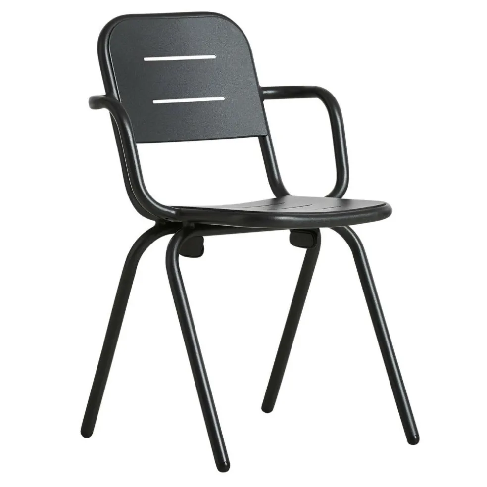 Der Ray Gartenarmlehnstuhl reduziert sich auf schlichte geometrische Formen. Die vier Stuhlbeine verjüngen sich nach oben hin. Einen interessanten Kontrast dazu bilden die rund geformten Armlehnen, die über die gesamt Sitzfläche gehen. Die Kanten der Sitzfläche und Rückenlehne sind ebenfalls abgerundet. Sie sind mit Spalten versehen, durch die Regenwasser im Nu abfließen kann. Wenn die Sonne durchscheint, entstehen interessante Muster am Boden. Hergestellt wird der Ray Gartenarmlehnstuhl aus pulverbeschichtetem Aluminium. Der Gartenstuhl eignet sich für diverse Einsatzbereiche und stellt eine bequeme Sitzgelegenheit dar. Er wird neben der Verwendung im Garten oder auf dem Balkon auch gerne im Freibereich eines Restaurants oder Cafés genutzt.