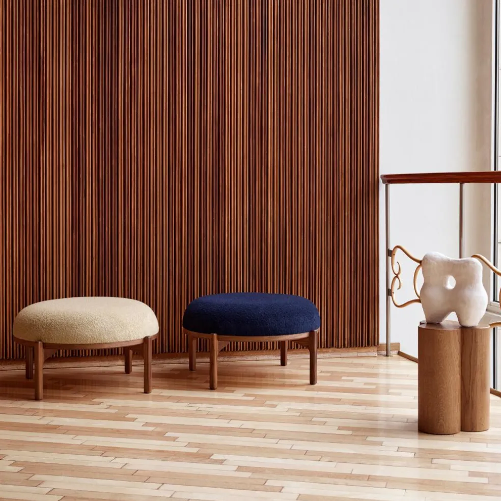 Der Rahmen des RF1903F Sideways Fußhockers besteht aus FSC®-zertifiziertem Walnussholz mit einer geölten Oberfläche. Er ist mit einem weichen Bezug aus Textil in variierenden Farben bezogen. Je nach Farbwahl besteht der Bezug aus einem Materialmix mit 70% Schurwolle und 30% Viskose oder einem Mix aus 87% Schurwolle, 10% Polyester und 3% Nylon. Der vormontierte Hocker ist sofort einsatzbereit.