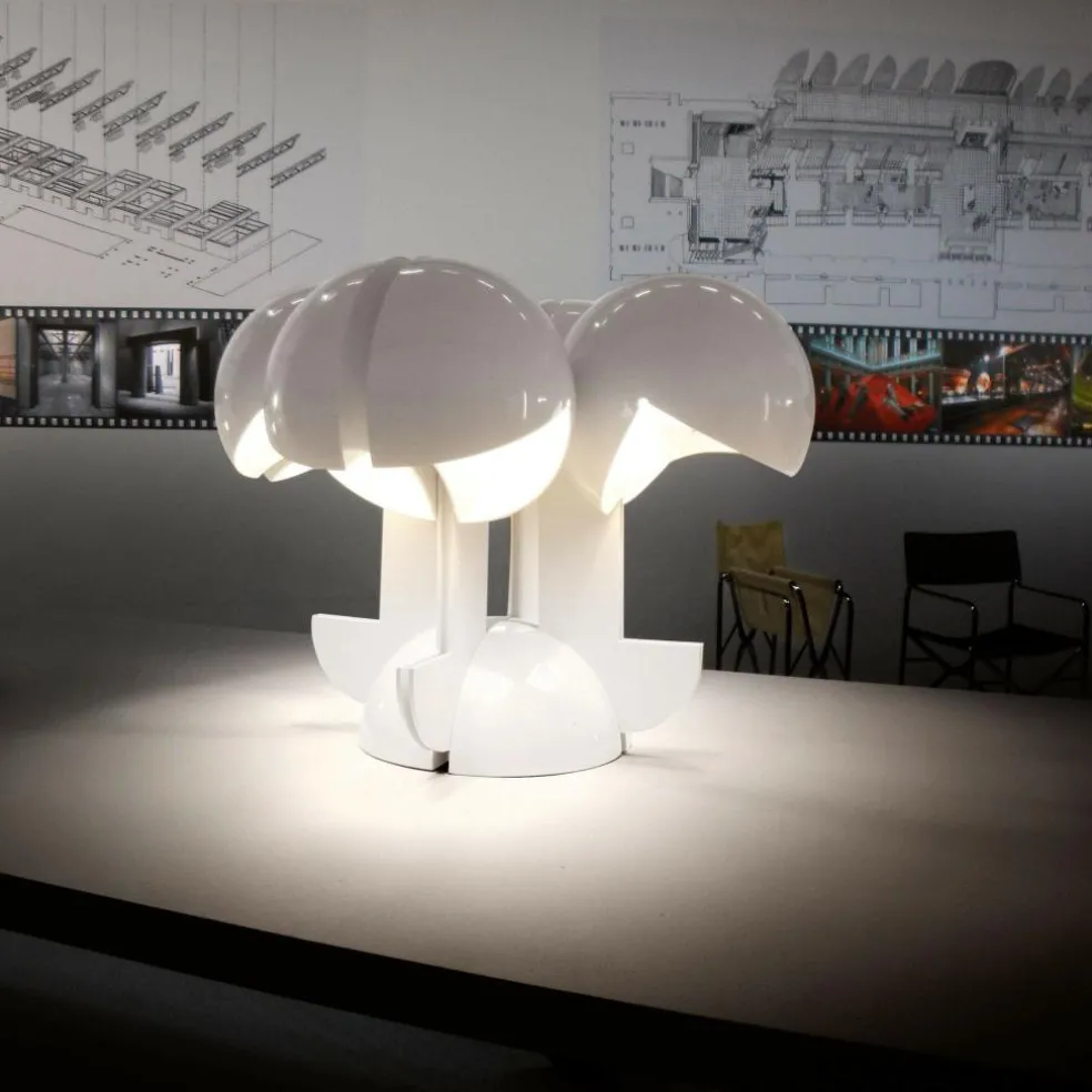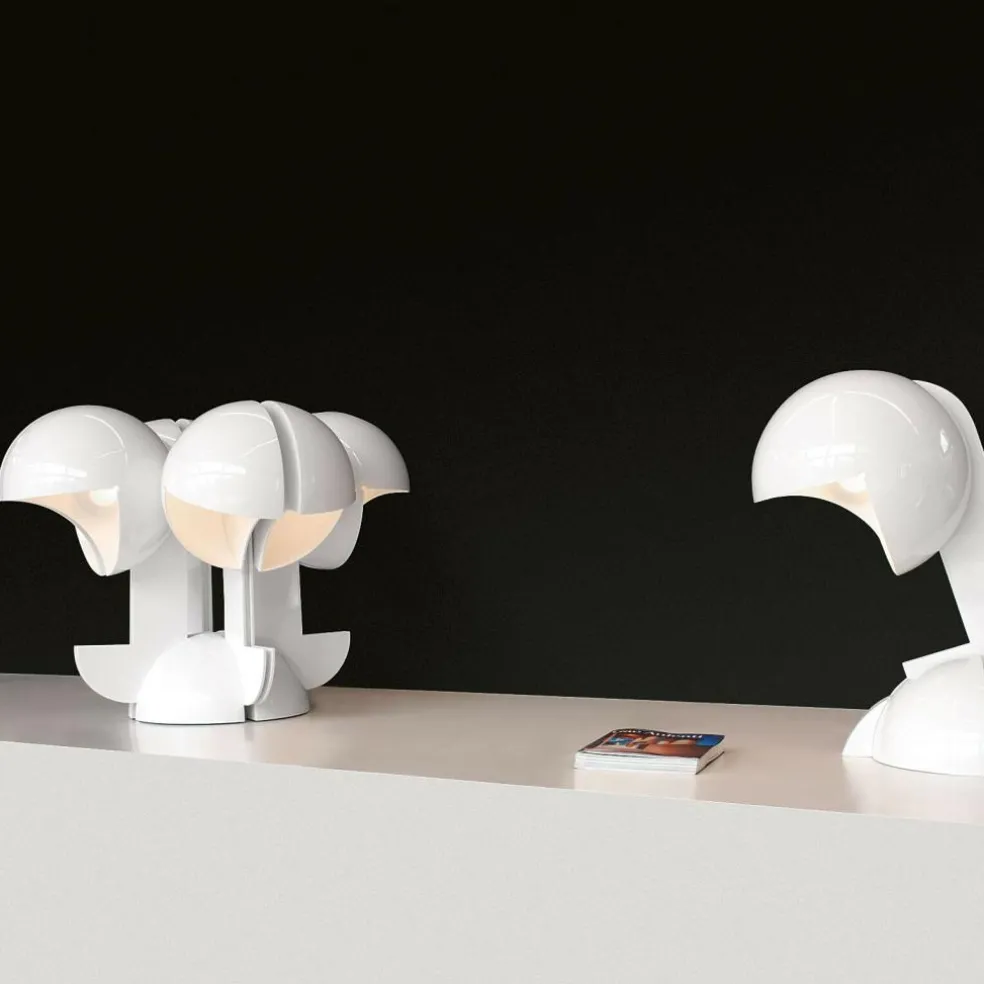 Die Ruspa/4 Tischleuchte wurde von Gae Aulenti für die Marke Martinelli Luce entworfen. Die Leuchte stammt aus dem Jahr 1968, einer Zeit, wo in Italien viele außergewöhnliche Leuchten entstanden. Auch heute noch ist sie mit ihrer innovativen Formgebung ein extravagantes Kunstobjekt.