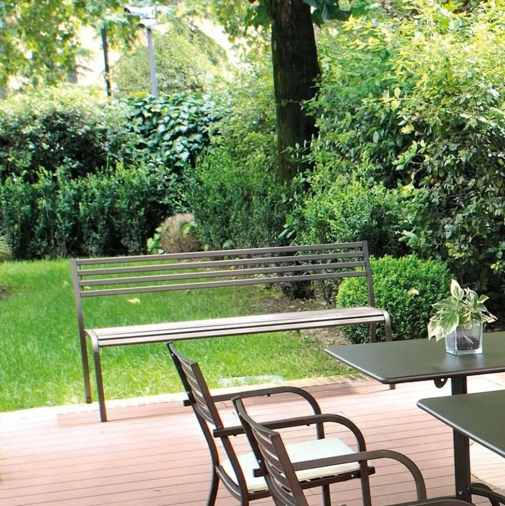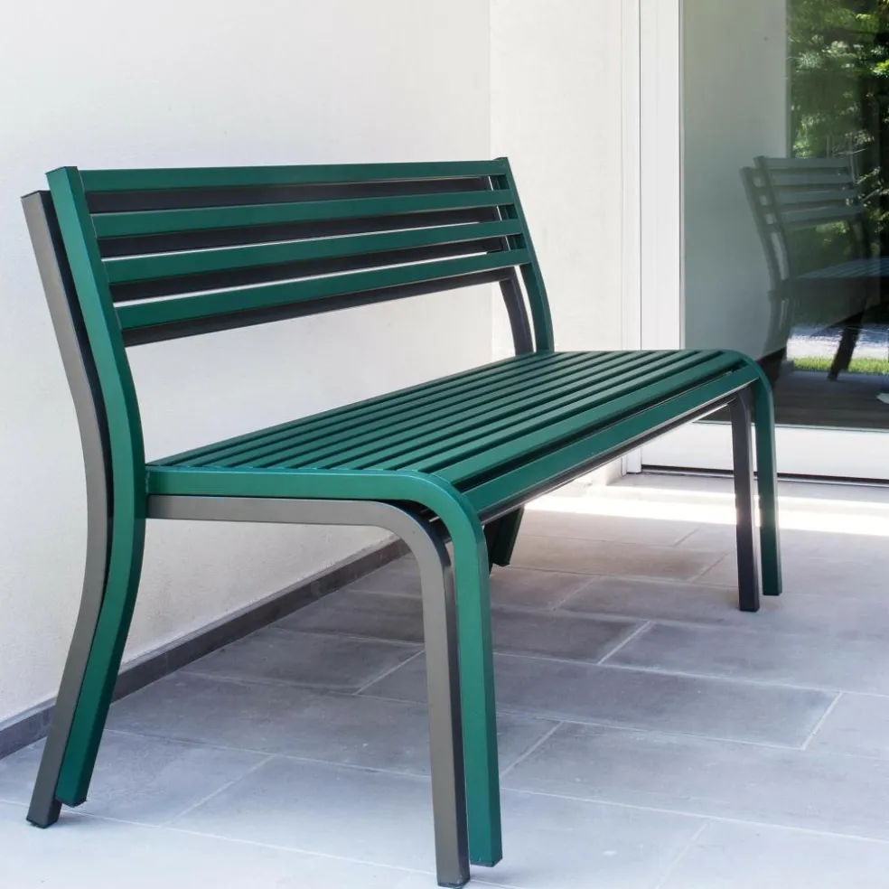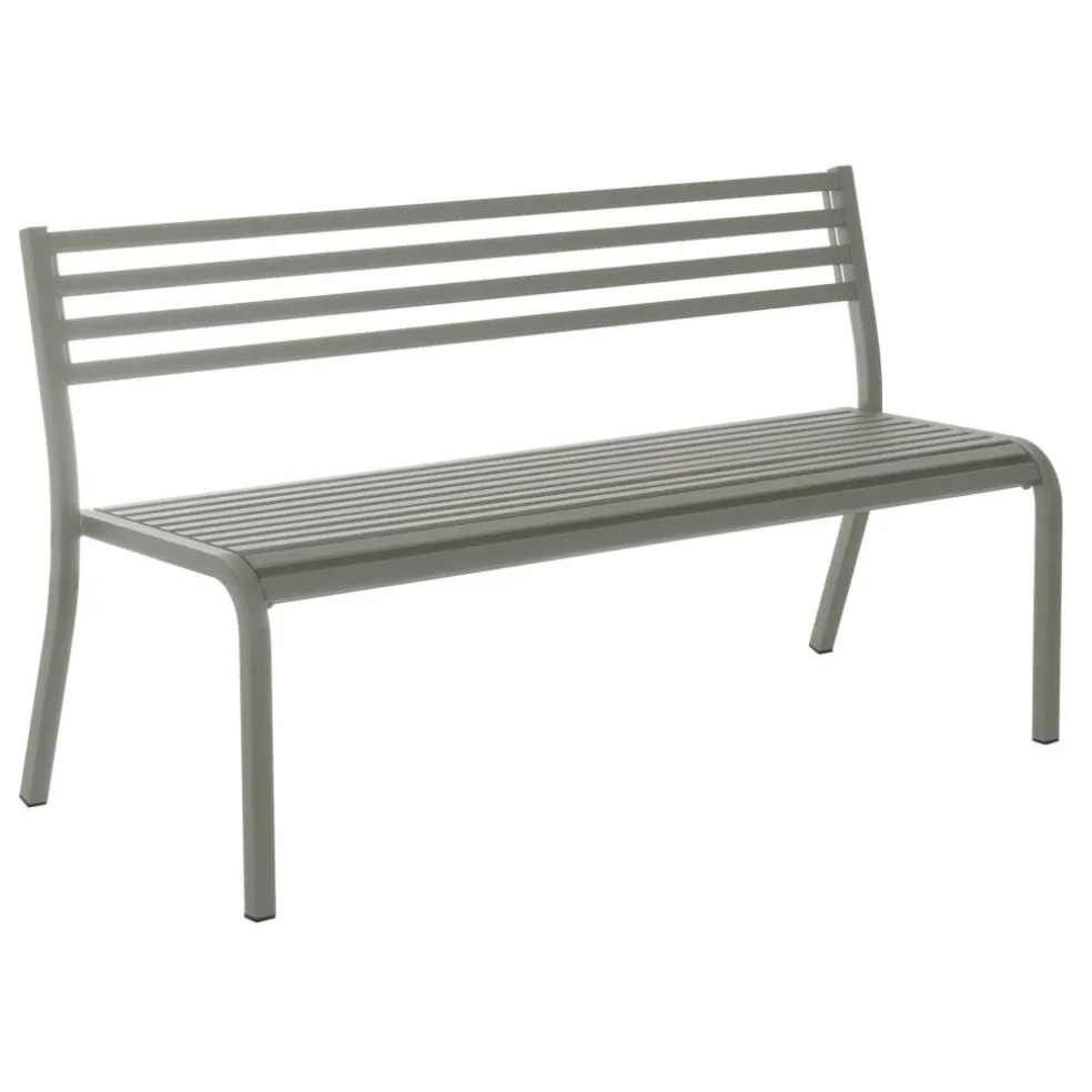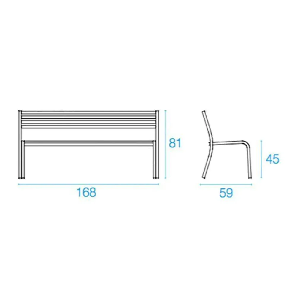 Zwei formschön gebogene Elemente aus Stahlrohr bilden die seitlichen Rahmenteile der Segno Gartenbank 168x59cm. So biegen sich die vertikalen Vorderbeine exakt im rechten Winkel zur Sitzfläche, während die sanft nach hinten geneigten Rahmen der Rückenlehne in einem abgerundeten stumpfwinkeligen Knick zu den ausgestellten rückwärtigen Beinen auslaufen. Dazwischen bilden lattenartig ausgeführte Stahlrohre Sitzfläche und Lehne der Bank. Sie schaffen eine rhythmische Struktur und erzeugen einen attraktiven Schatten. Mit rechteckigem Querschnitt ausgeführt, versprechen ihre abgerundeten Kanten ein angenehmes Sitzgefühl. Auch die über die vordere Bankkante gebogene Sitzfläche schenkt der Segno Gartenbank 168x59cm einen einladenden Charakter. Das bequeme Outdoormöbel passt an die Hauswand, vor eine Hecke oder mitten in die Wiese im Park eines Hotels, im Freiraumbereich vor öffentlichen Gebäuden oder im Garten.