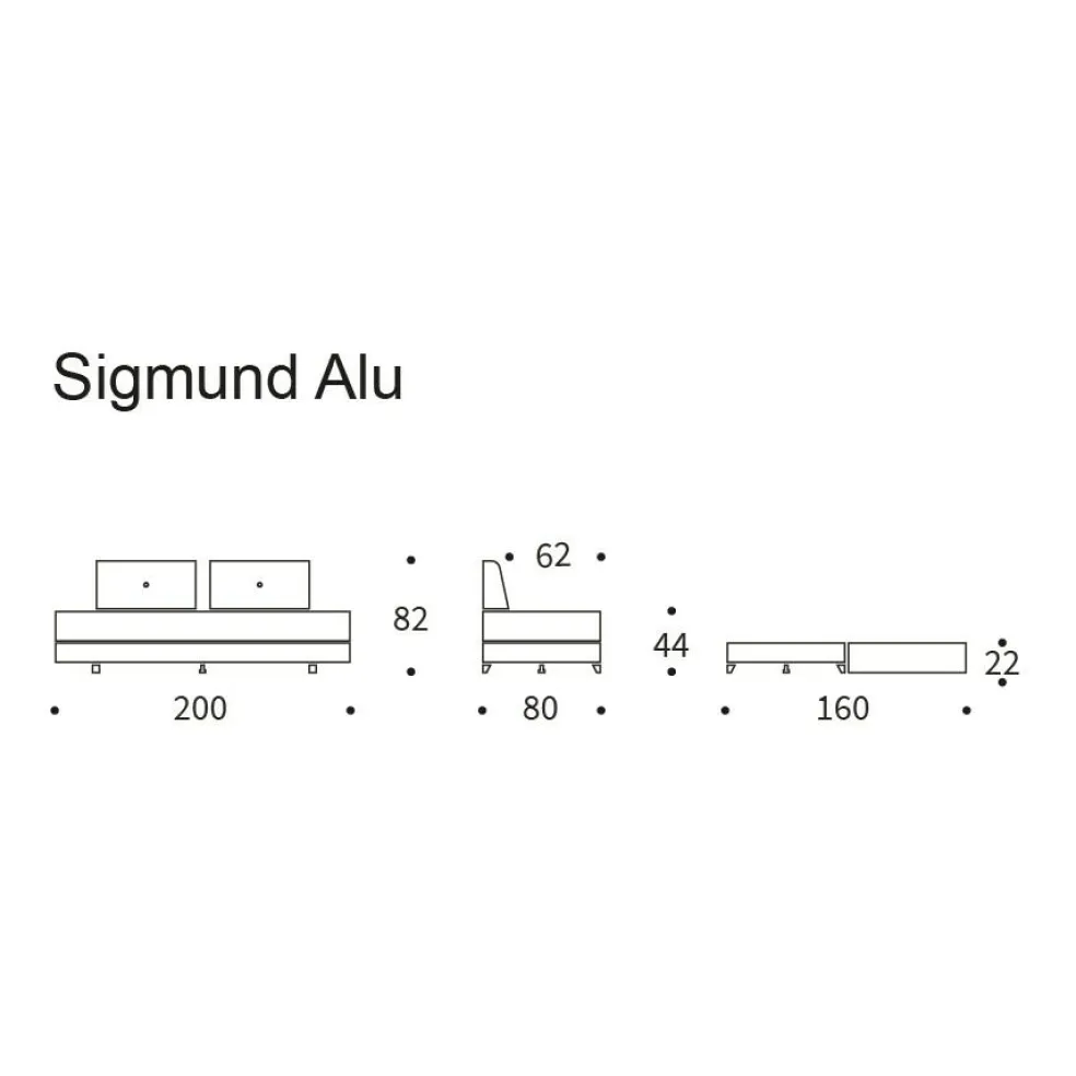 Das Sigmund Alu Schlafsofa 200x84cm hat eine Breite von 200cm und eine Tiefe von 84cm. Seine Sitzhöhe beträgt 44cm. Die Gesamthöhe des Designmöbels ist maximal 82cm. Es hat ein Gewicht von 53kg und ist in verschiedenfarbigen Ausführungen zu haben.