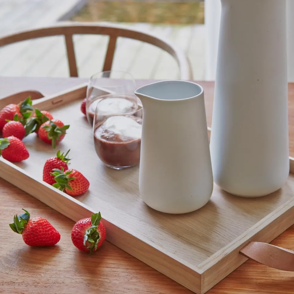 Die Lieber zur Natur wird beim Norr Tablett zunächst einmal an der ungewöhnlichen Materialauswahl ersichtlich. Das geschmackvolle Design aus Eichenholz wird hier mit zwei schmalen Lederbändern verschönert. Dadurch sieht das Norr Tablett nicht nur besonders dynamisch und charmant aus. Es trägt sich auch deutlich angenehmer. Und selbst wenn es mal etwas stärker beladen ist, fällt hier nichts herunter. Denn mehr als genug Platz ist hier auf jeden Fall vorhanden. Der Durchmesser des Norr Tabletts beträgt 25,5 x 46,2 cm. Hier trägt man alles, was man zum Frühstück braucht, ganz leicht fort. Dass das ganz leicht funktioniert, liegt nicht zuletzt an dem geringen Gewicht des Norr Tabletts. Es wiegt gerade einmal 0,8 kg.