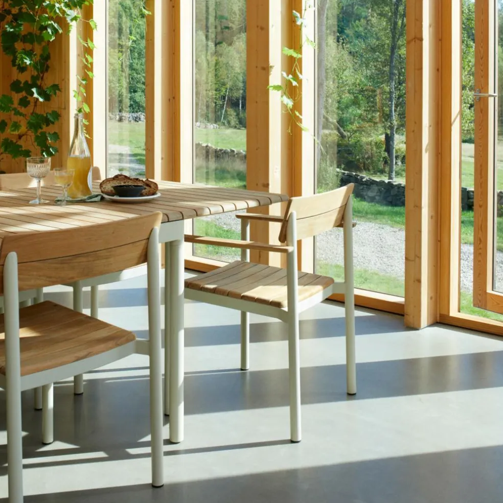 Der Skagerak Pelagus Gartenarmlehnstuhl von Fritz Hansen, entworfen vom Note Design Studio, verbindet minimalistisches Design mit hochwertigen Materialien.