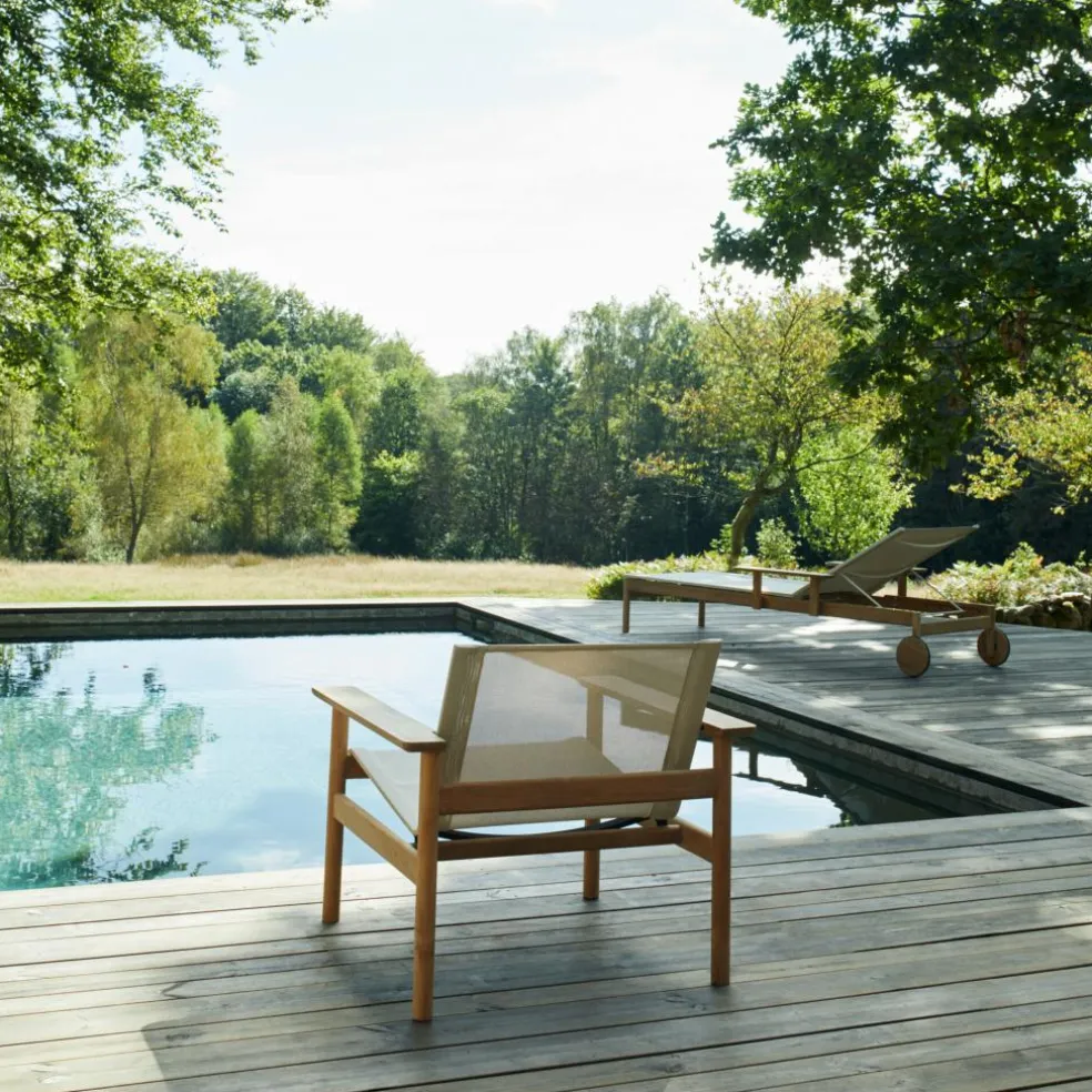 Der Pelagus Lounge Stuhl wurde von NOTE Design Studio für die Marke Skagerak entworfen. Er gehört zu einer Kollektion von Outdoormöbeln, die nach einem Ort in der Toskana benannt sind.