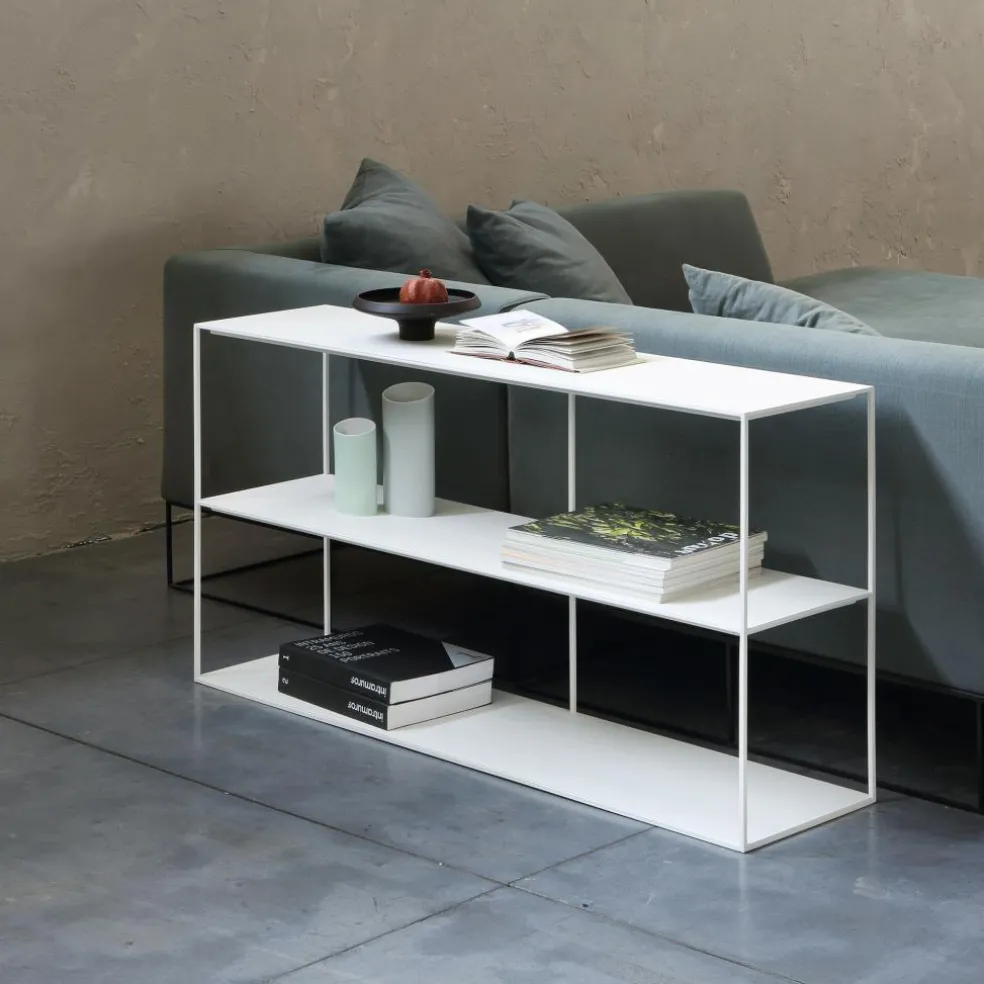 Ein filigranes Gestell und ein geradliniges Design zeichnet das Slim Irony 2021 Regal 124x31x64cm aus. Die hochwertige Verarbeitung und der Einsatz robuster Materialien macht es perfekt für den täglichen und intensiven Gebrauch. Das schlichte Gestell wird aus Vierkantstahlrohr gemacht. Der Boden, die obere Platte und das Einlagebrett bestehen aus Stahlblech. Eine Epoxylackierung sorgt dafür, dass die Oberfläche lange wie neu aussieht. Das Gestell besteht aus vier horizontalen Eckstreben und einem Stahlrohr an der Rückseite des Slim Irony 2021 Regals 124x31x64cm.Das Modell ist in verschiedenen Farbausführungen und wahlweise mit einer Oberfläche in Sandeffekt zu haben.