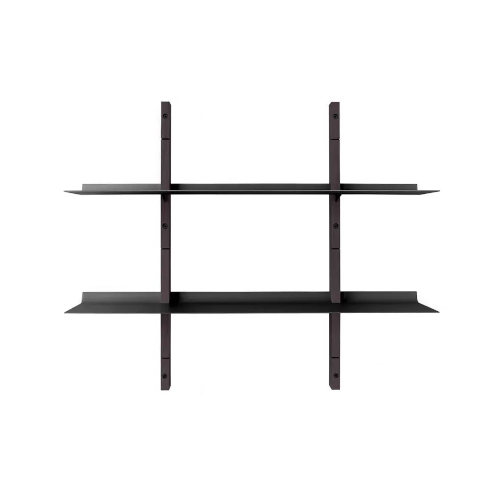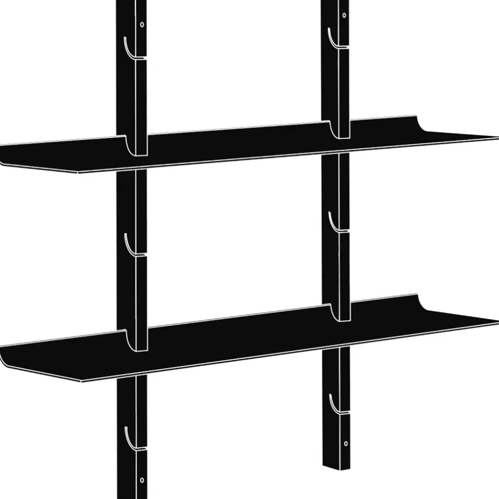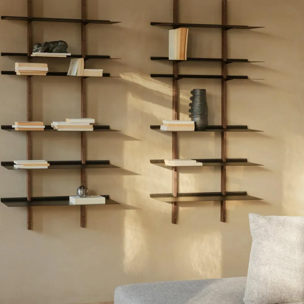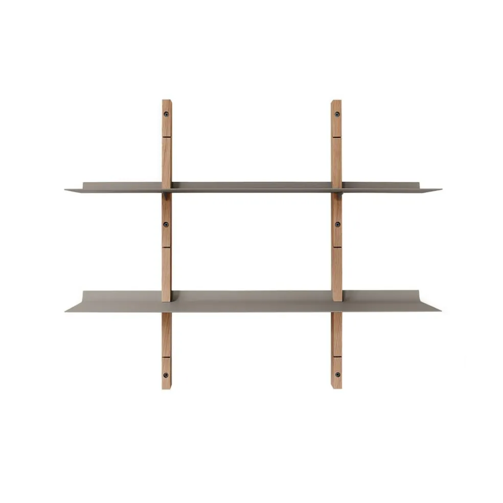 Das Smile Set Regalsystem S zeigt, wie stilvoll minimalistische Einrichtung sein kann. Einmal mehr wird das Designerduo, das hinter Tools Design steckt, seinem Anspruch gerecht, Möbel zu erschaffen, wo die Form der Funktion folgt. Gekonnt setzt das Smile Set Regalsystem S Dekorationsartikel, Bücher und viele weitere Gegenstände in Szene. Es kann im Wohn- oder Schlafzimmer, im Büro oder sogar in der Küche verwendet werden. Als Basis dienen zwei Eichenholzwangen, die senkrecht montiert werden. Darin sind Schlitze eingearbeitet. Sie tragen die beiden Einlagebretter. Sie werden einfach eingesteckt und müssen nicht zusätzlich mit Halterungen oder Stifte arretiert werden. Die Einlageböden sind hinten nach oben gebogen, sodass Bücher und andere Utensilien nicht herunterfallen können. Die Böden werden aus robustem, pulverbeschichtetem Stahl hergestellt.