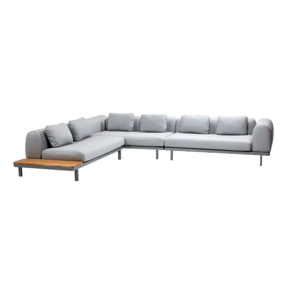 Die Basis der Space Outdoor Sofalandschaft 360x285x69cm bildet ein robuster Stahlrahmen. Gerade geschnittene, dünne Beine garantieren festen Stand und verleihen dem Modell ein luftiges Flair. Ausgezeichnet ist der Sitzkomfort auf den 3 rechteckigen geschnittenen Polstern, die als Sitzfläche dienen. Weitere Kissen mit einer halbrunden Oberseite bilden die Rücken- und Armlehne. Die Polsterung ist nach dem QuickDry-&-AirFlow-System gefertigt und besteht aus Schaumstoff. Der Bezug ist aus Cane-line Airtouch, einem Material aus Acryl, das sich mit hervorragender Haptik auszeichnet. An der kurzen Seite schließt die Space Outdoor Sofalandschaft 360x285x69 mit einem kleinen Tisch aus Teakholz ab. Das Naturmaterial verleiht dem Modell eine wohnliche Atmosphäre. Da alle Elemente der Space Outdoor Sofalandschaft 360x285x69cm witterungsbeständig sind, kann das Ensemble auch bei schlechtem Wetter im Freien bleiben.