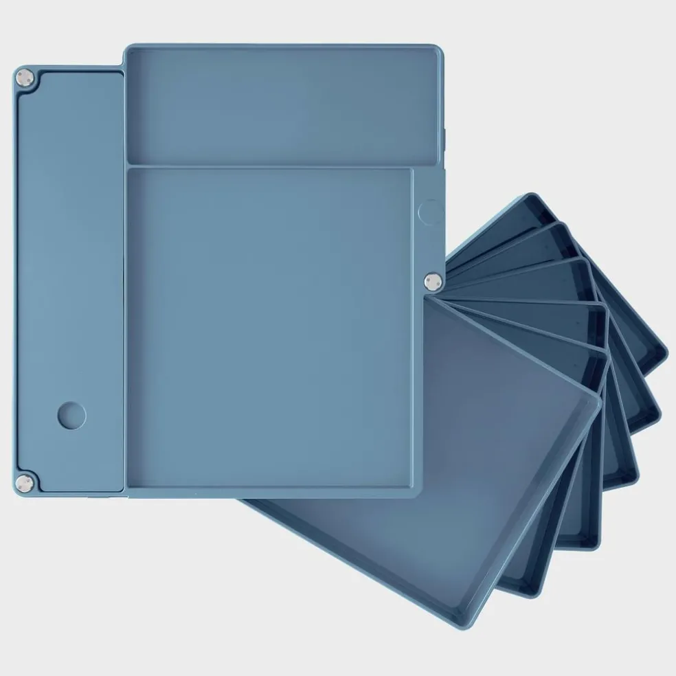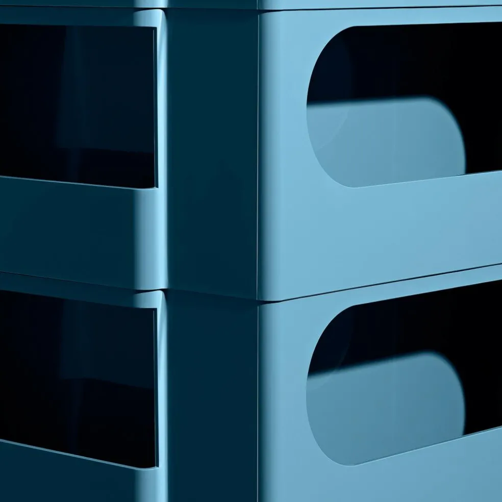 Sein Gestell ist aus spritzgegossenem ABS-Kunststoff gefertigt und besteht aus vier vertikal aufeinandergesetzten Modulen mit acht schwenkbaren Schubladenfächern und fünf offenen Fächern. Leichtgängige Rollen aus Polypropylen sorgen für Mobilität. Bei einem Gewicht von 17kg ist der Rollcontainer 94,5cm hoch, 43cm breit und 42cm tief. Aus der Kollektion stehen weitere Größen und Farbvarianten des Möbels zur Auswahl.