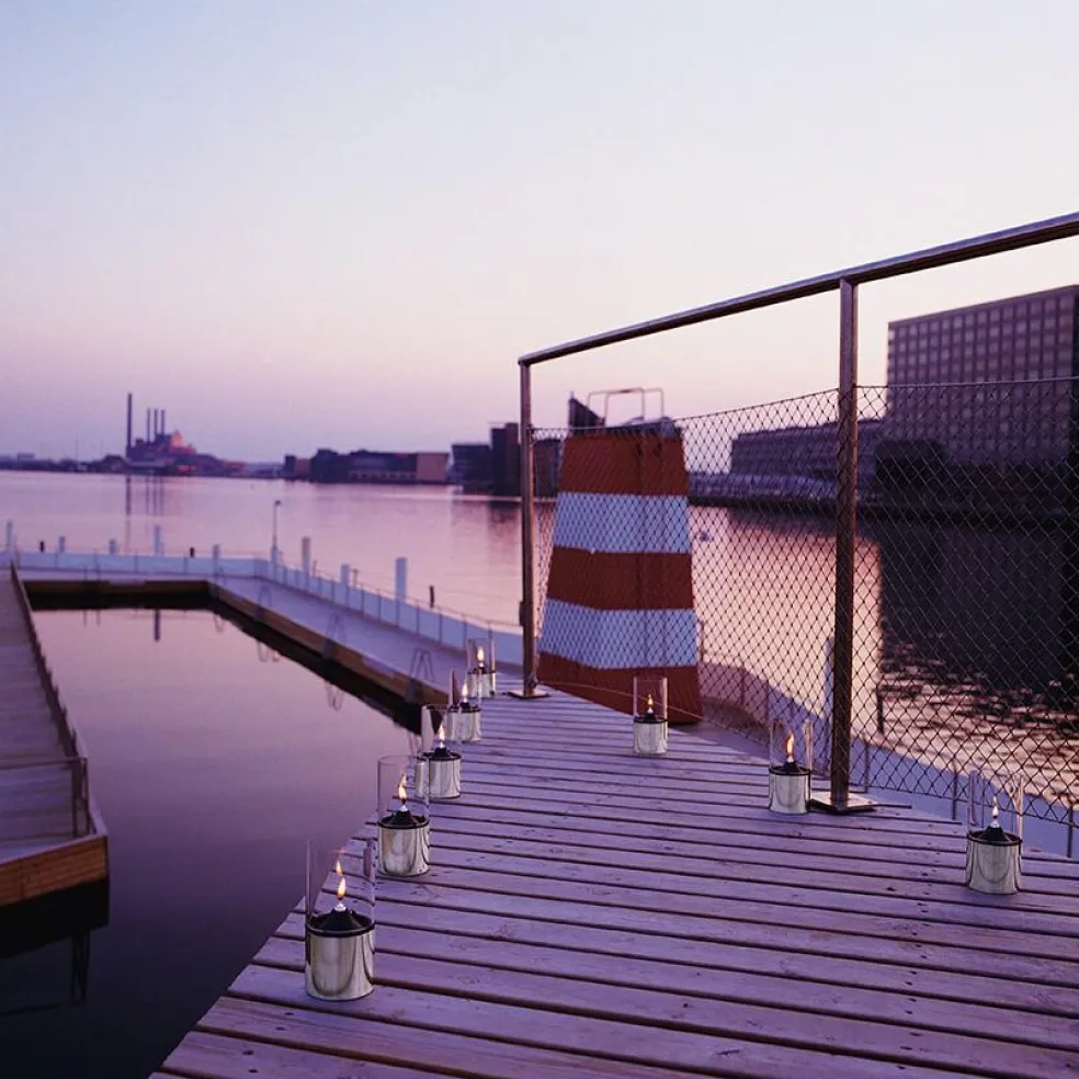 Die Stelton Öllampe bringt maritimen Stil in den Außenbereich. Das Modell erinnert eindeutig an die Lichtquellen, die früher auf Schiffen verwendet wurden. Die Basis wird aus satin-poliertem Edelstahl gemacht. Auf dem zylinderförmigen Gestell ist ein ebenfalls zylinderförmiger Schirm aus Borosilikatglas montiert. Das Material ist hitzebeständig und verfärbt sich nicht. So ist stets der Blick auf die Flamme frei. Zum Befüllen werden das Glas und die Dochthalterung der Stelton Öllampe abgenommen. Durch ein Loch kann man in den in der Basis integrierten Behälter Petroleum oder Lampenöl einfüllen. Bis zu 300 ml fasst der Behälter. Es wird empfohlen, den Docht in einer Länge von 2 mm bis 4 mm herausragen zu lassen. Da er aus Glasfaser besteht, verbrennt er nicht. Nach dem Befüllen muss die Dochthalterung wieder gut angezogen werden.