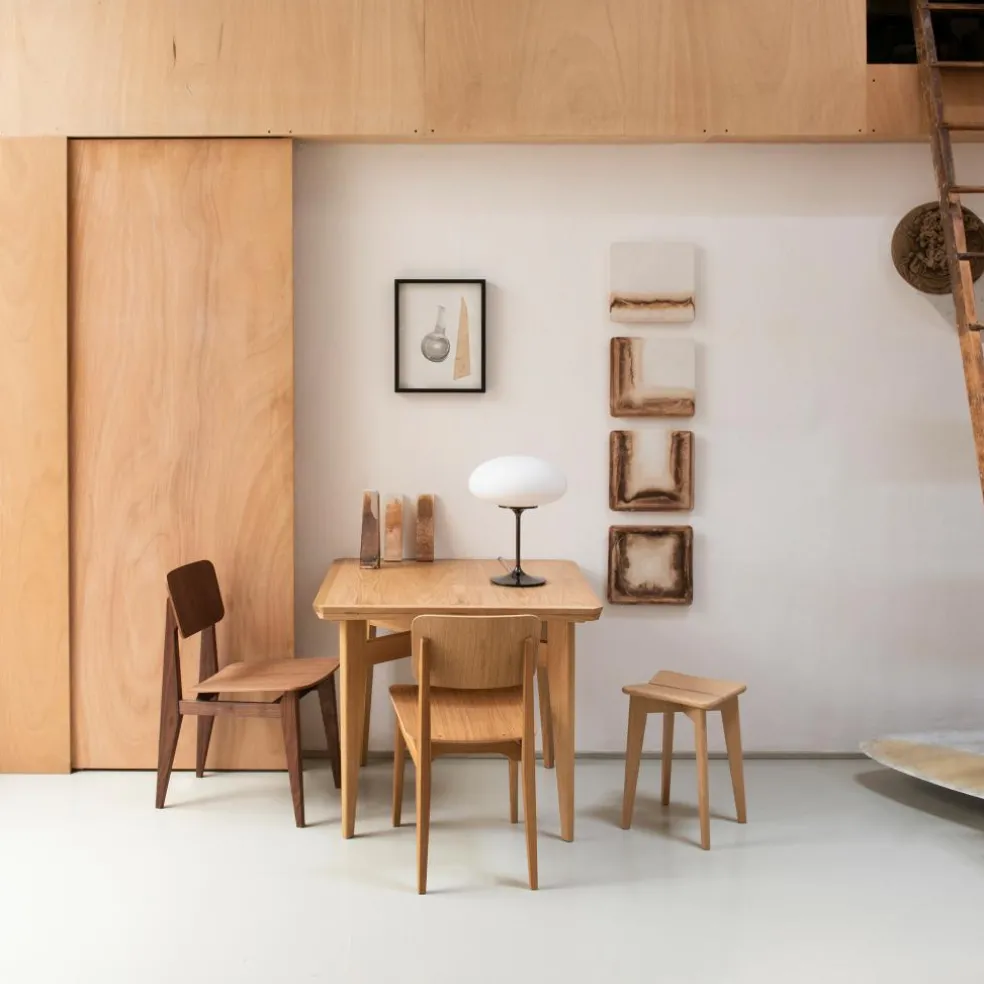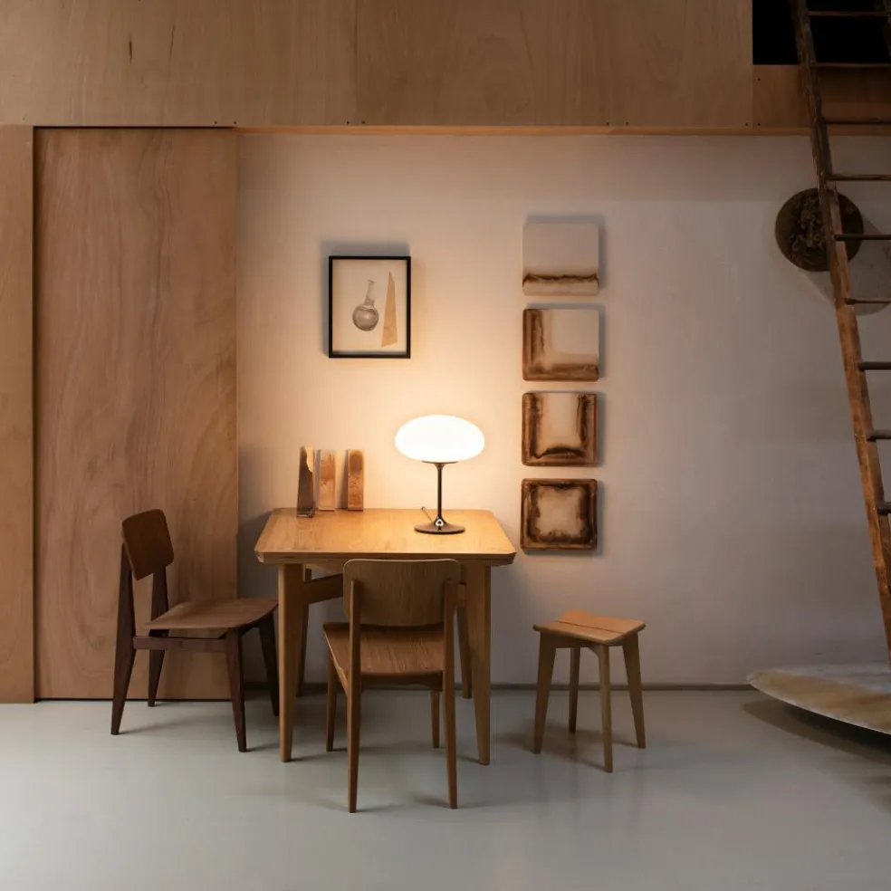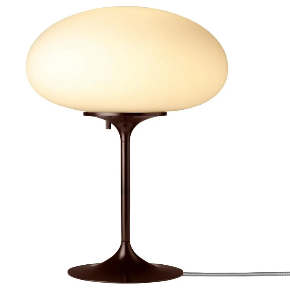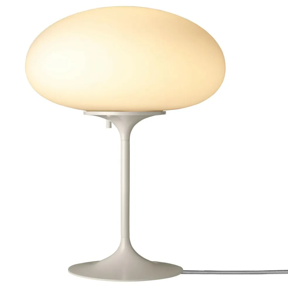 Die Stemlite Tischleuchte H 42cm wurde von Bill Curry für die Marke Gubi entworfen. Als sie im Jahr 1962 auf den Markt kam, war sie die erste im Total-Look entworfene Leuchte. Sie bestand nicht wie die Modelle zuvor aus einem Sockel mit darauf montiertem Schirm, sondern wurde aus einem Guss gefertigt.