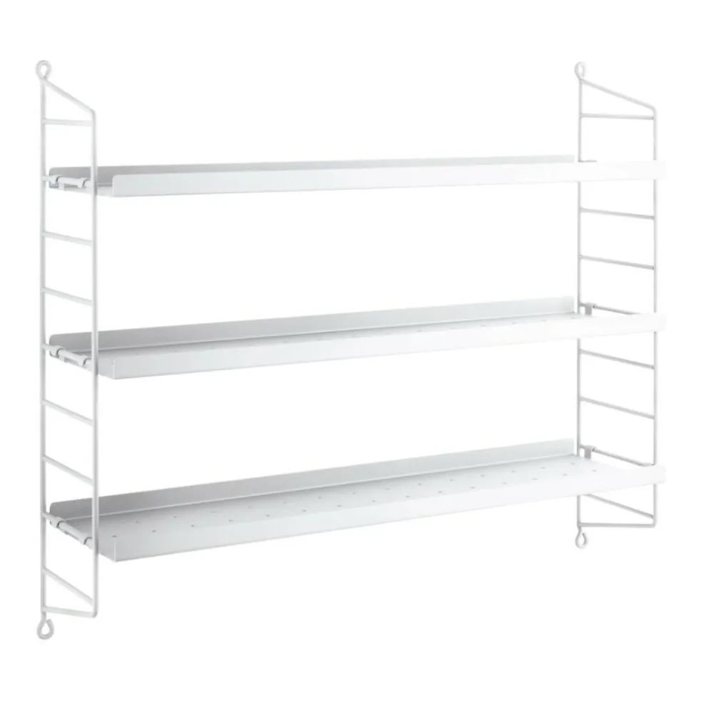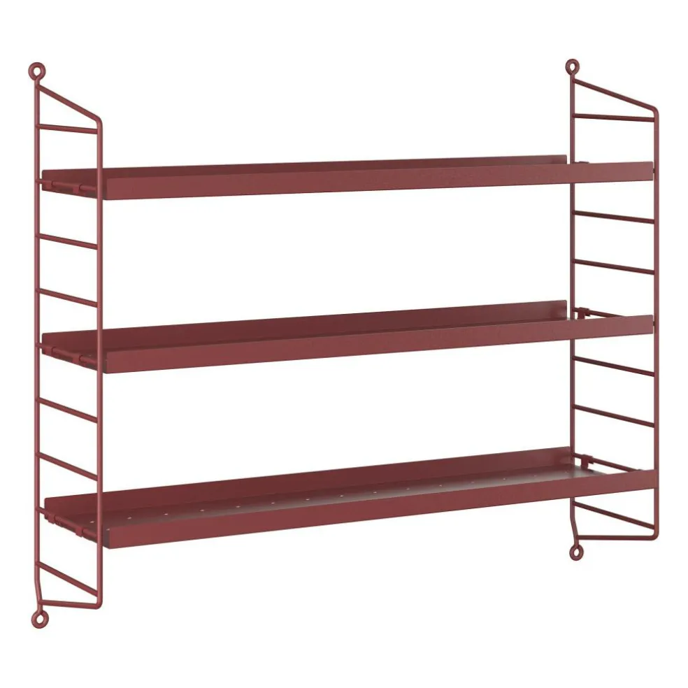 Das String Pocket Metall Regal 60x50x15cm ist ein kompaktes Möbelstück, das sich für verschiedene Einsatzbereiche eignet. Es verdankt seinen Namen seinen praktischen Abmessungen und den leiterähnlichen Seitenwänden. Das Regal wird zur Gänze aus Metall hergestellt. An den dünnen Sprossen der Seitengestelle kann man verschiedene Gegenstände wie Schöpflöffel in der Küche einhängen. Im Lieferumfang sind drei gelöcherte Einlagebretter enthalten. Sie können in beliebiger Höhe eingehängt werden. Da sie vorne und hinten nach oben gezogen sind, können darauf abgestellte Gegenstände nicht herunterfallen. Die Oberfläche ist mit wasserbasiertem Lack überzogen. Er weist eine geringe Schadstoffbelastung auf. Das String Pocket Metall Regal 60x50x15cm kann man in verschiedenen Farben bestellen. Es passt in die Küche, in Jugend- und Wohnzimmer und Büros.