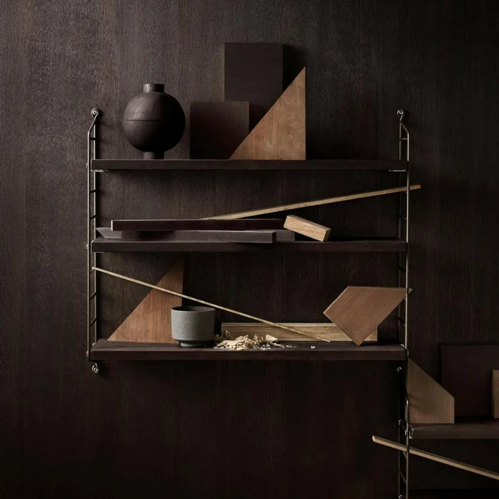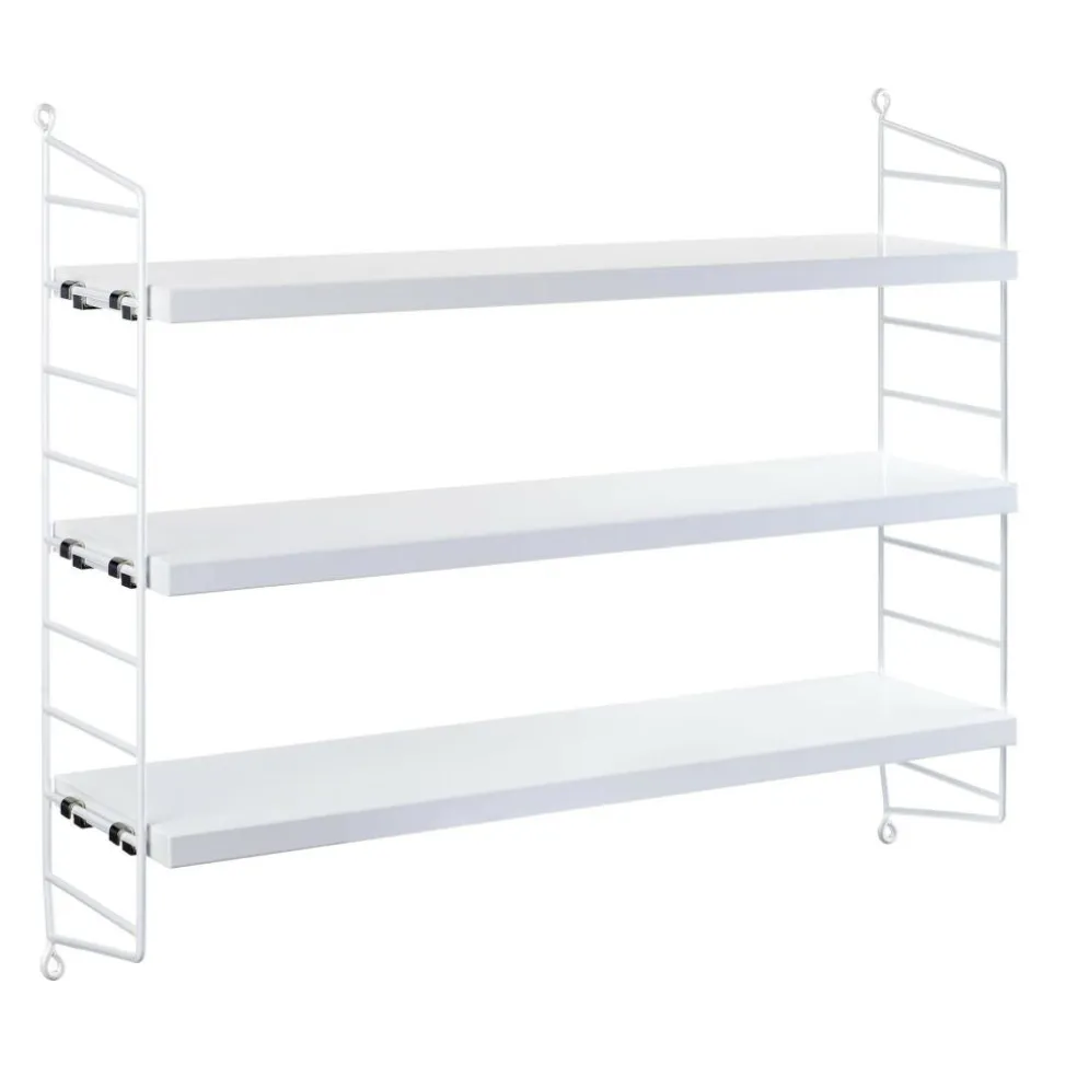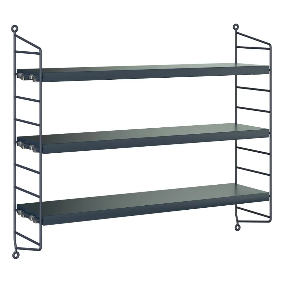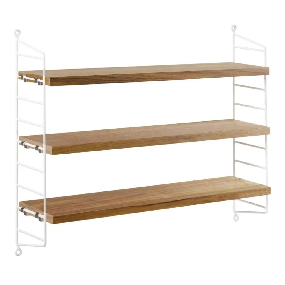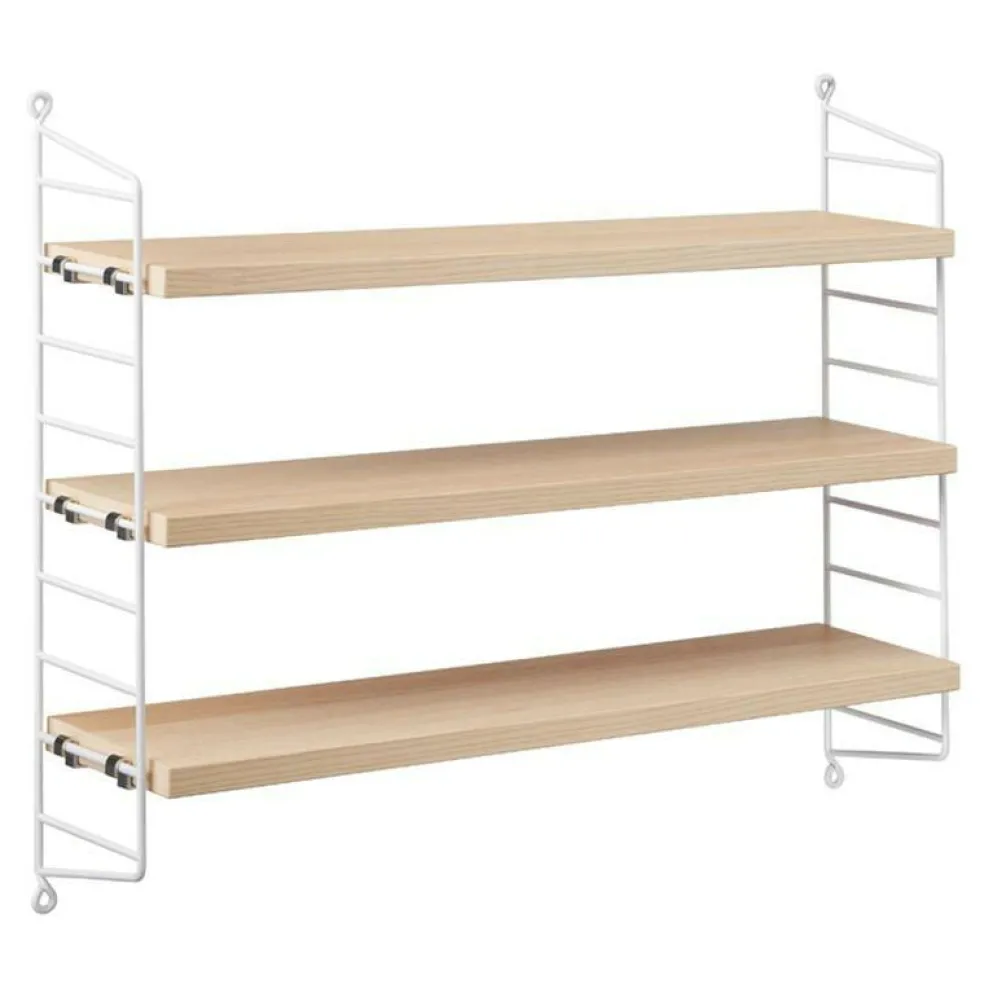 Das String Pocket Regal 60x50x15cm ist in jedem Raum ein praktischer Alltagshelfer. In der Küche können darauf Kräuter, Gewürze und Geschirr abgestellt werden. Es eignet sich auch für Büros, Wohn- und Kinderzimmer. Die seitlich montierten Regalwände ähneln einer Leiter. Zwischen den Sprossen können die drei mitgelieferten Einlagebretter in beliebiger Höhe eingehängt werden. Dazu dienen Klemmen aus Zink. Das Gestell besteht aus pulverbeschichtetem Stahl. Er ist mit wasserbasiertem und schadstoffarmem Lack überzogen. Für die Einlagebretter verwendet der Designer Holz. Es stehen unterschiedliche Farb- und Holzvarianten wie Esche, Eiche und Walnuss sowie zur Auswahl. Jedes Einlagebrett kann mit maximal 25 kg belastet werden.