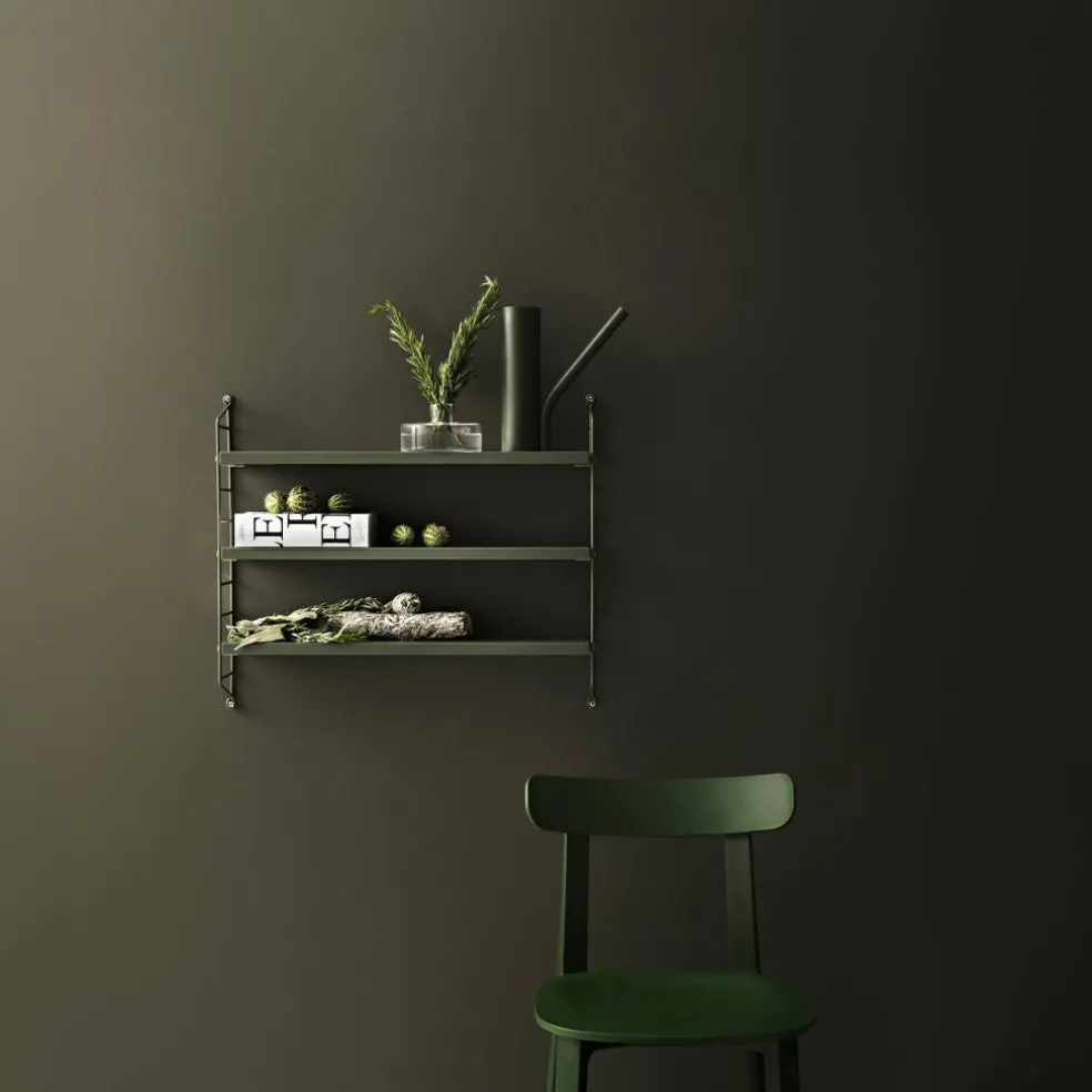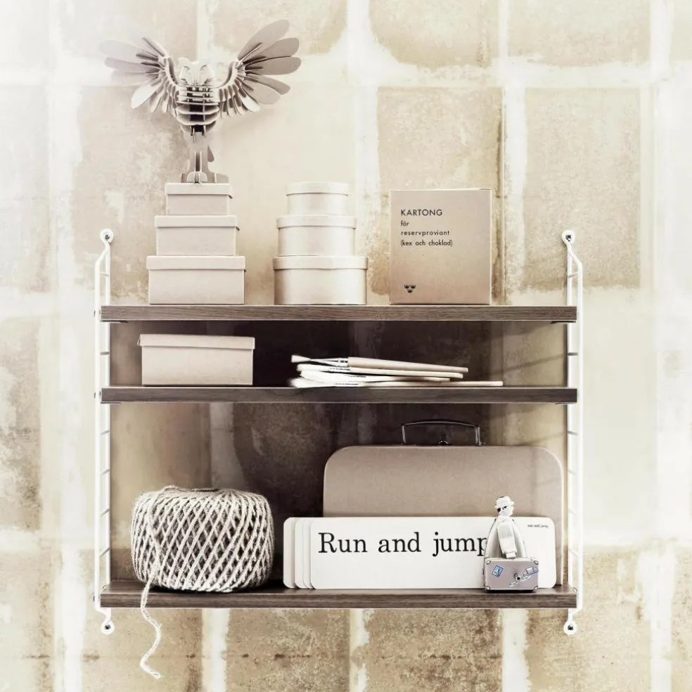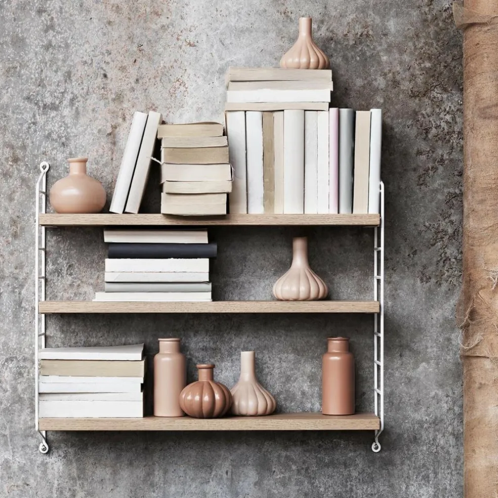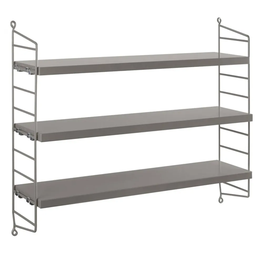 Das String Pocket Regal 60x50x15cm ist in jedem Raum ein praktischer Alltagshelfer. In der Küche können darauf Kräuter, Gewürze und Geschirr abgestellt werden. Es eignet sich auch für Büros, Wohn- und Kinderzimmer. Die seitlich montierten Regalwände ähneln einer Leiter. Zwischen den Sprossen können die drei mitgelieferten Einlagebretter in beliebiger Höhe eingehängt werden. Dazu dienen Klemmen aus Zink. Das Gestell besteht aus pulverbeschichtetem Stahl. Er ist mit wasserbasiertem und schadstoffarmem Lack überzogen. Für die Einlagebretter verwendet der Designer Holz. Es stehen unterschiedliche Farb- und Holzvarianten wie Esche, Eiche und Walnuss sowie zur Auswahl. Jedes Einlagebrett kann mit maximal 25 kg belastet werden.
