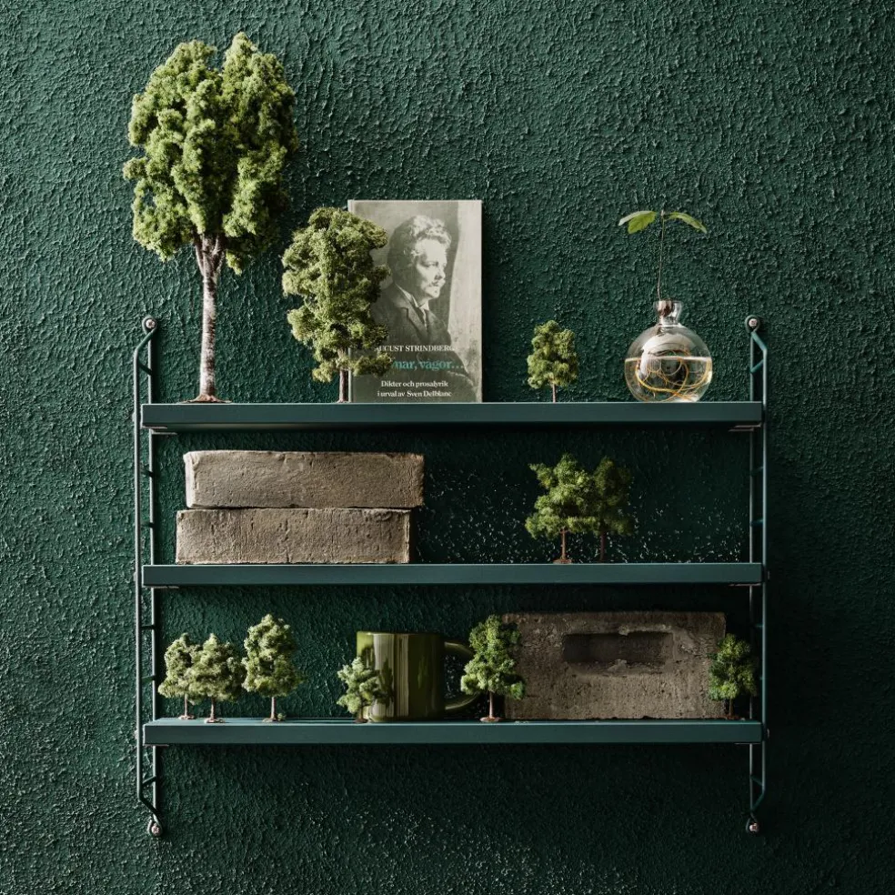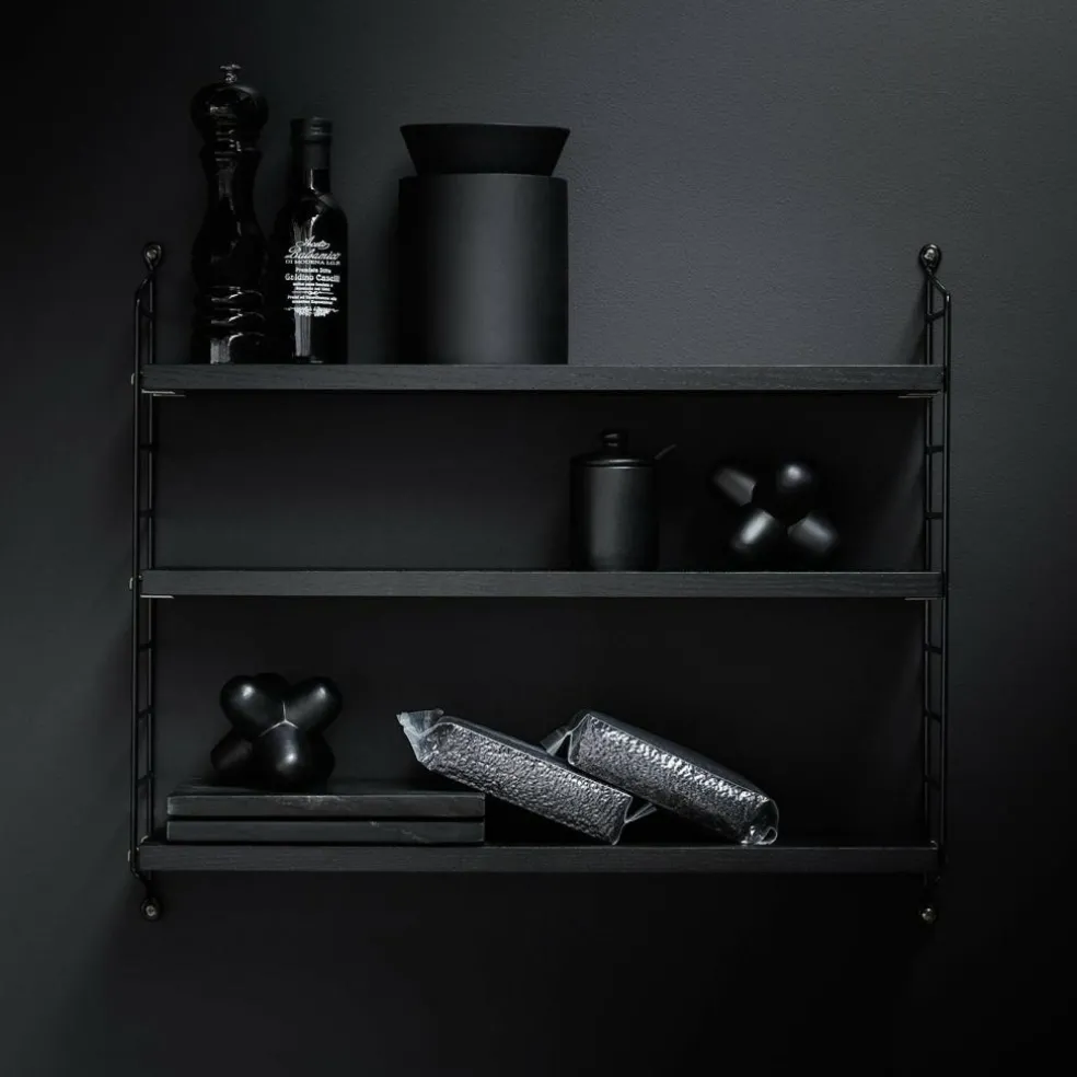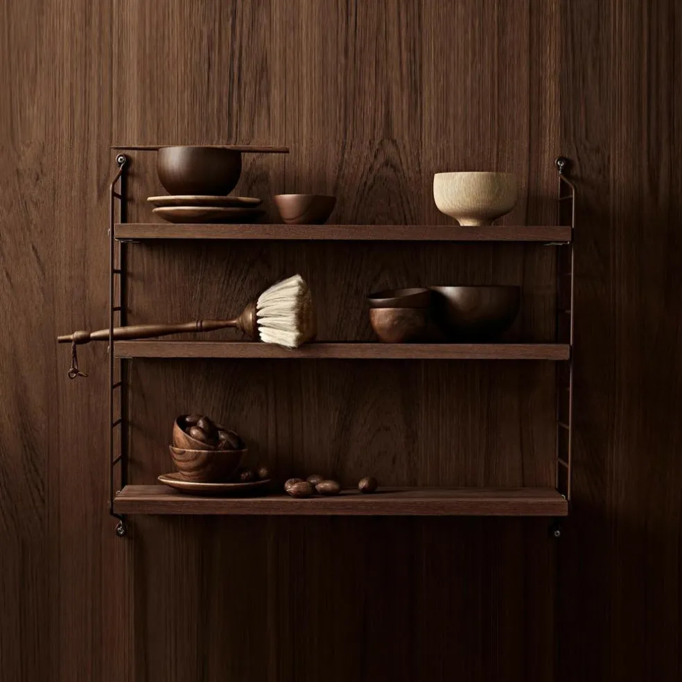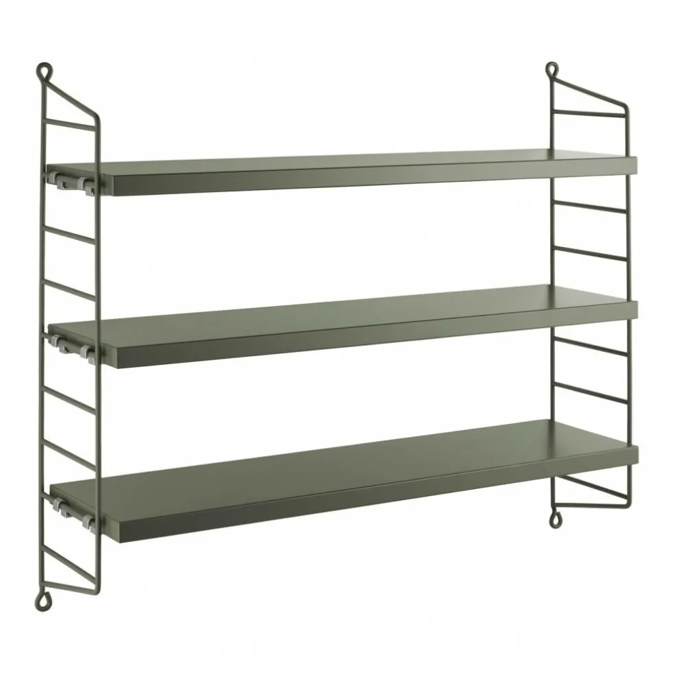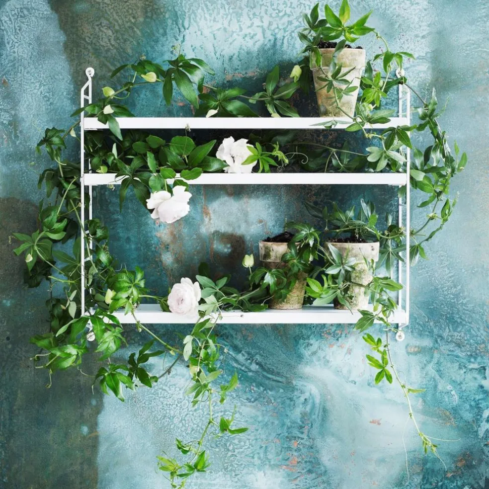 Das String Pocket Regal 60x50x15cm ist in jedem Raum ein praktischer Alltagshelfer. In der Küche können darauf Kräuter, Gewürze und Geschirr abgestellt werden. Es eignet sich auch für Büros, Wohn- und Kinderzimmer. Die seitlich montierten Regalwände ähneln einer Leiter. Zwischen den Sprossen können die drei mitgelieferten Einlagebretter in beliebiger Höhe eingehängt werden. Dazu dienen Klemmen aus Zink. Das Gestell besteht aus pulverbeschichtetem Stahl. Er ist mit wasserbasiertem und schadstoffarmem Lack überzogen. Für die Einlagebretter verwendet der Designer Holz. Es stehen unterschiedliche Farb- und Holzvarianten wie Esche, Eiche und Walnuss sowie zur Auswahl. Jedes Einlagebrett kann mit maximal 25 kg belastet werden.