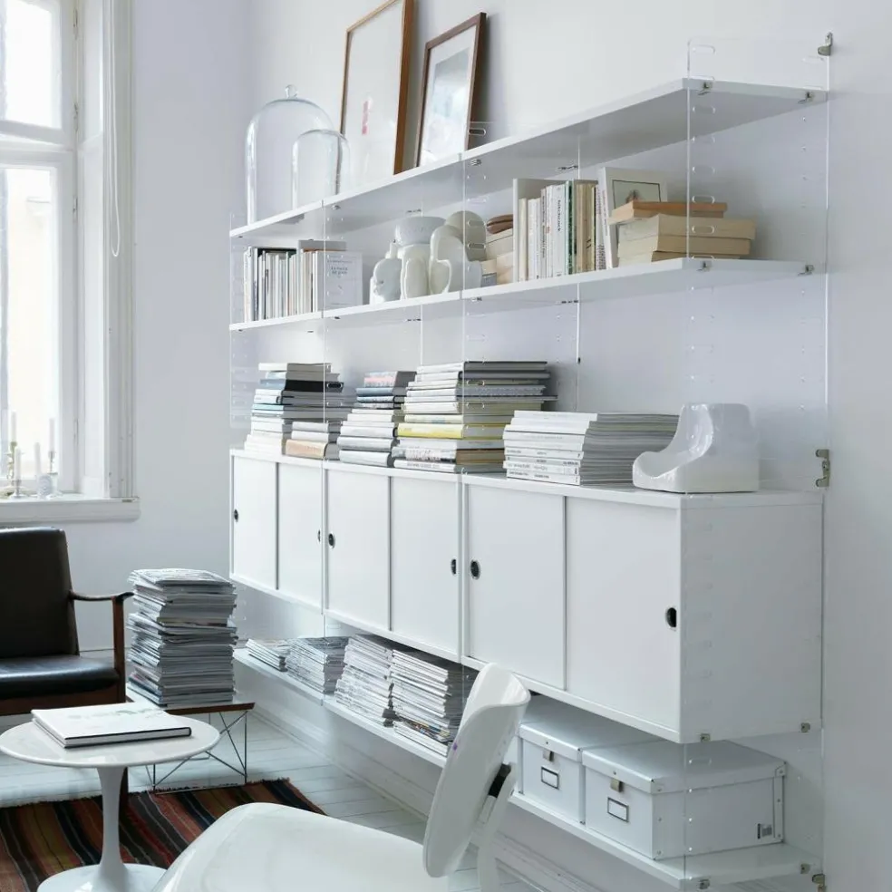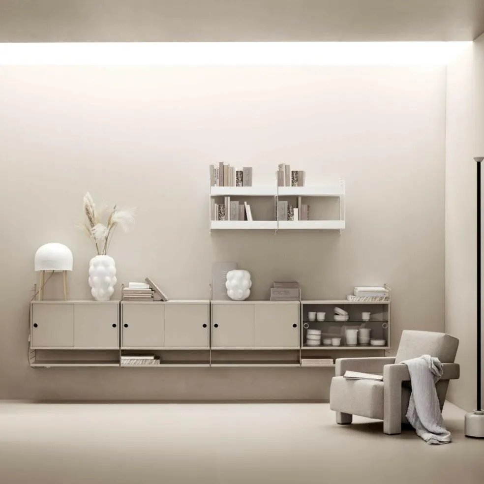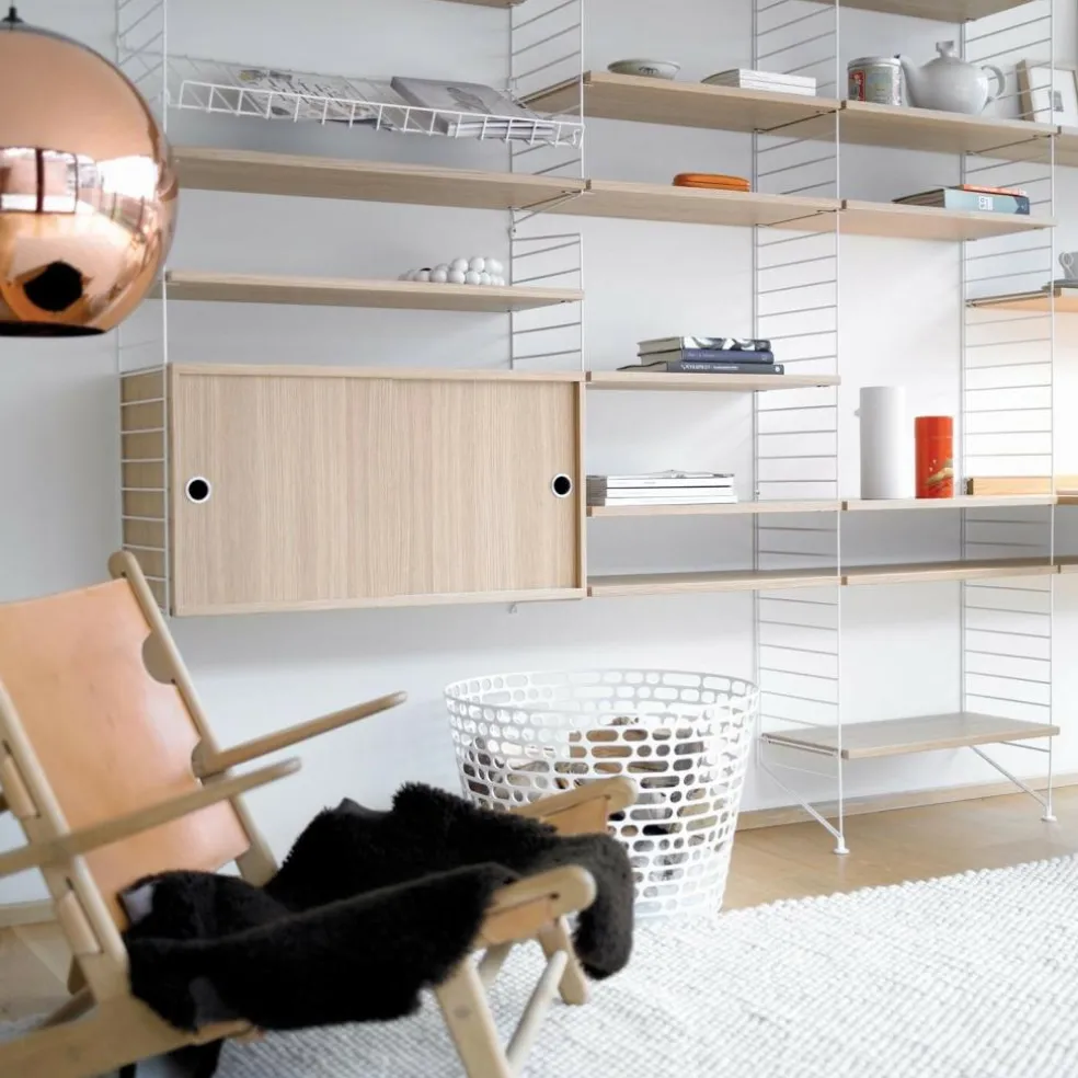 Kombinieren Sie den String Hängeschrank mit Schiebetüren ganz nach Wunsch mit den anderen String Elementen, diese finden Sie unter „Kollektion“. Mit String können Sie sich ganz einfach das Regal Ihrer Träume entwerfen – viel Vergnügen!
