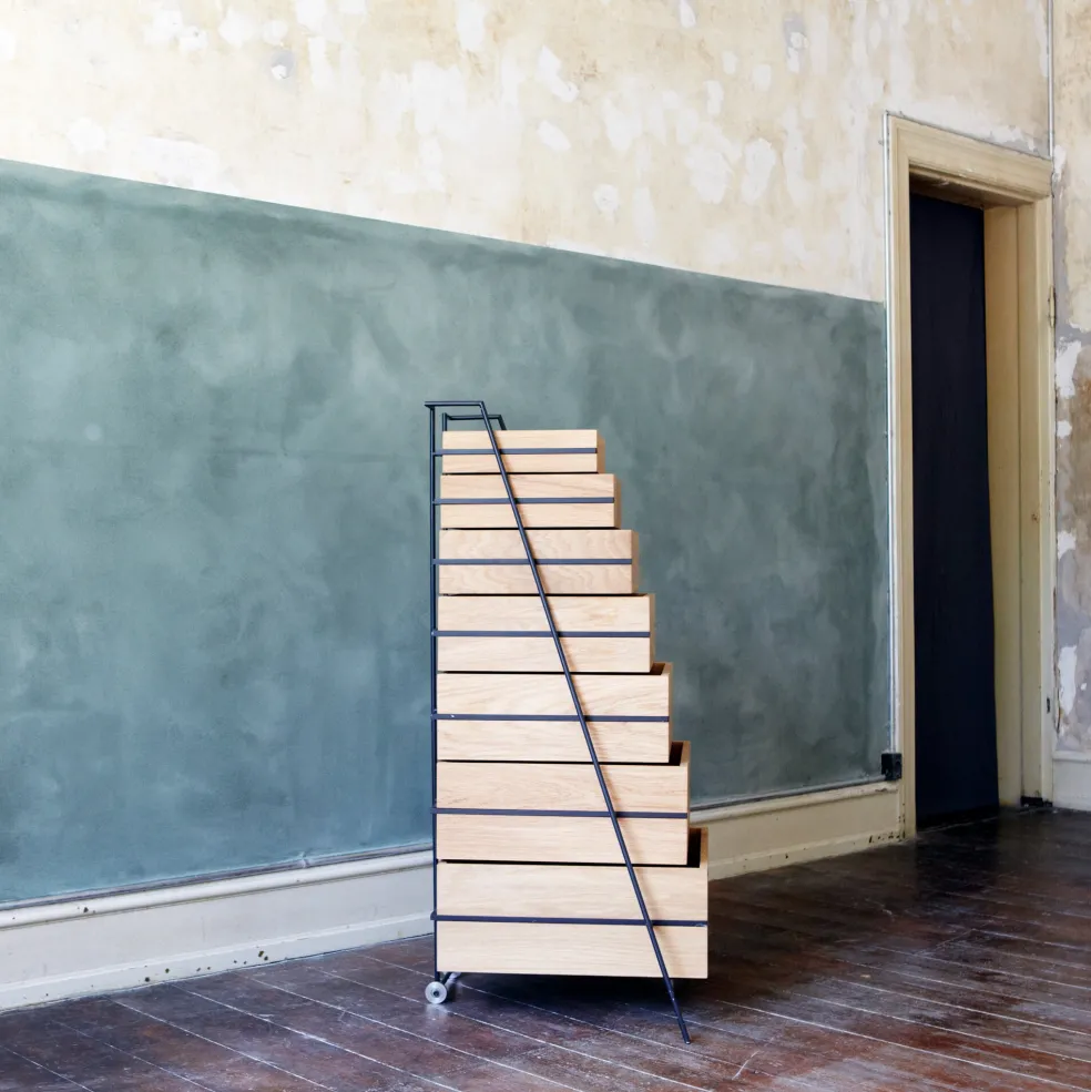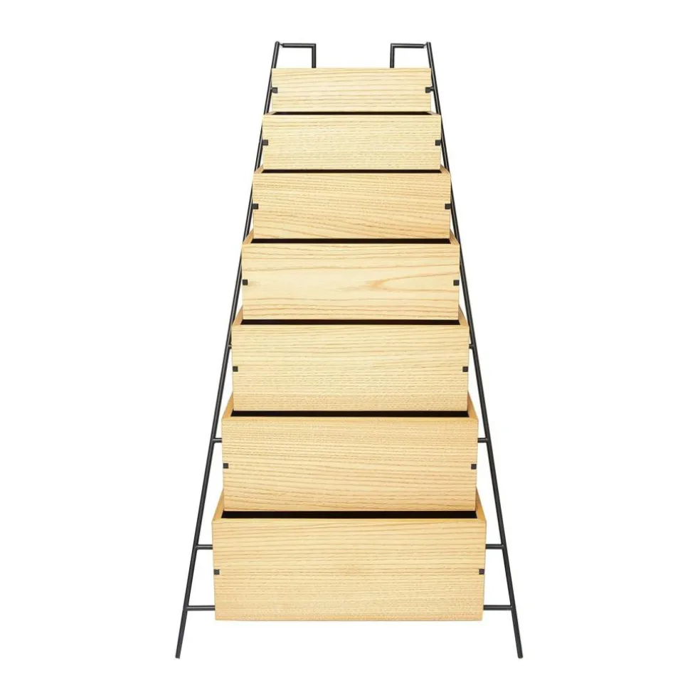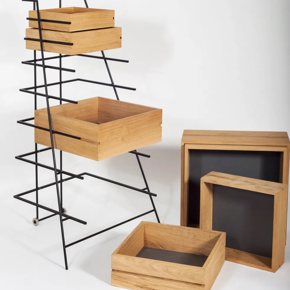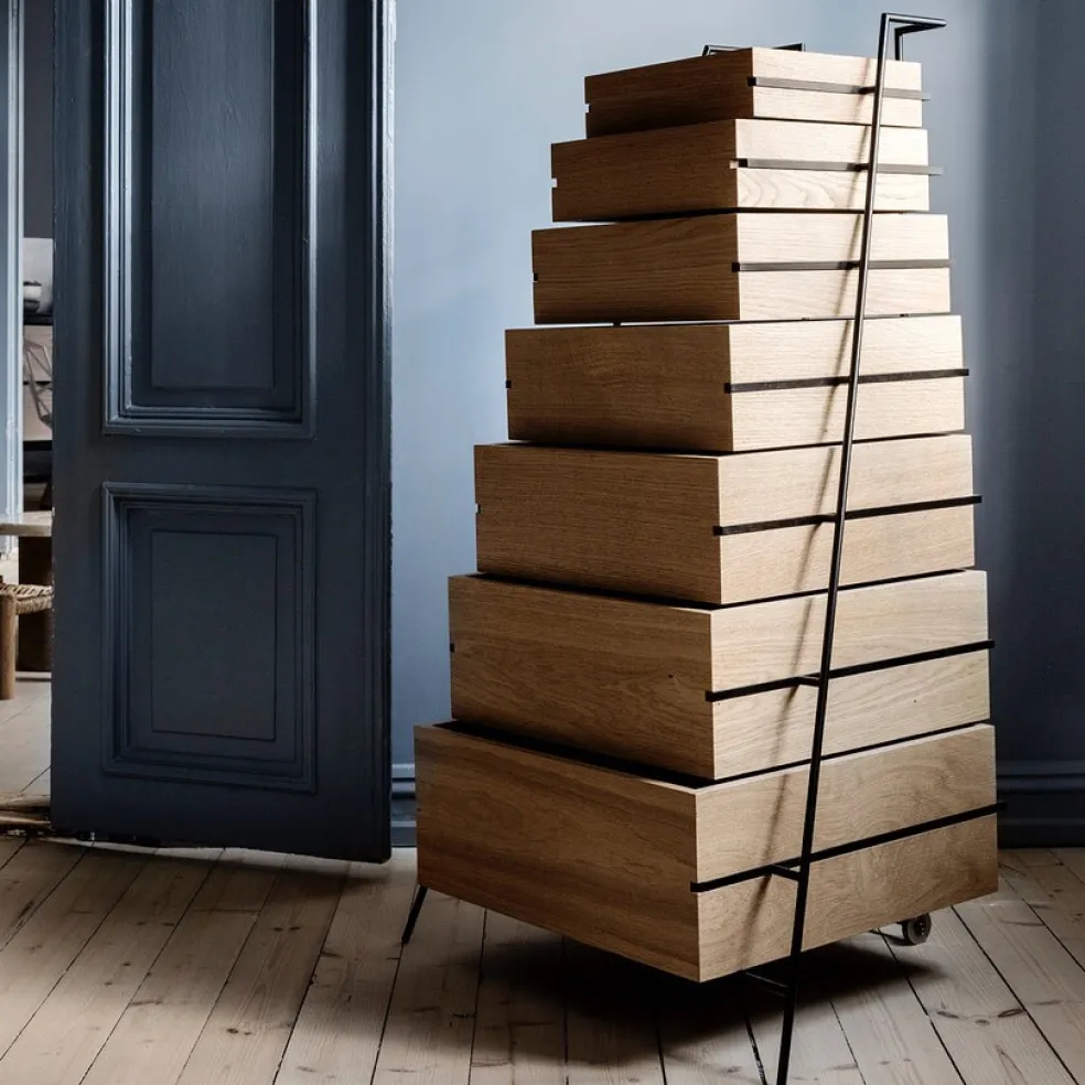 Ein dezenter Stahlrahmen bildet das Gestell vom Sutoa Aufbewahrungsschrank/-kiste. Die Streben an der Vorderseite laufen schräg nach oben; an der Hinterseite des Gestells sind ganz unten zwei Rollen montiert. Kippt man den Kasten leicht nach hinten, lässt er sich bequem rollen. Somit kann man den Sutoa Aufbewahrungsschrank/-kiste in ein anderes Zimmer transportieren, ohne die Kisten auszuräumen. In den Rahmen werden sieben Boxen aus robustem Eichenholz eingehängt, die wohnliches Flair verbreiten. Sie haben unterschiedliche Größen, wobei das Volumen von unten nach oben hin abnimmt. Bei ungebrauchtem Zustand können die Kisten ineinander gestapelt werden.