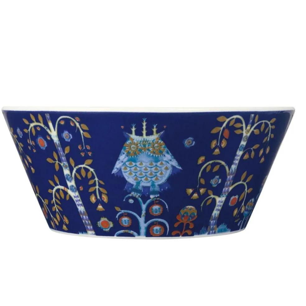 Die Taika Schale wird in den Farben Blau, Weiß und Schwarz angeboten. In allen Farbstellungen sind die typischen Illustrationen mit Eule und Pfau, kunstvoll ausgeführten Bäumen und Ornamenten auf der Rundung der Schale aufgebracht. Die Farbstellungen Blau und Weiß zeigen die Illustrationen in fein abgestuften Farbtönen der Farben Blau, Weiß, Rot und Grün, während die Schale in der Farbstellung Schwarz die Illustration in einem schwarzen Farbton auf weißem Hintergrund wiedergibt.