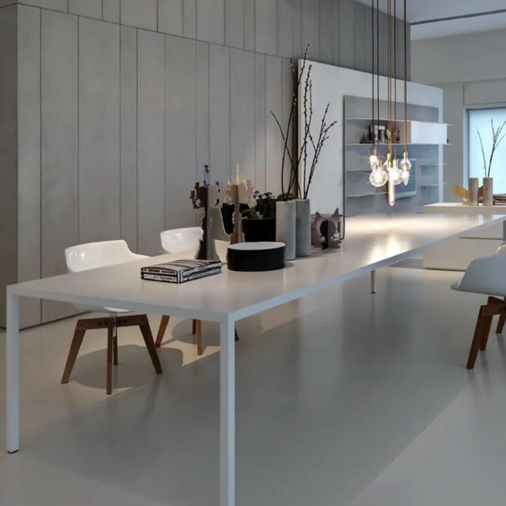 Durch technologische Innovation konnte die Produktion von groß dimensionierten Tischplatten realisiert werden. Die 35mm starke Tischplatte der Tense Tische von MDF Italia wird mit einem mehrteiligen Paneel hergestellt. Der ganze MDF Italia Tense Tisch wird mit einer 3mm dünnen Acrylharzfolie und Steinmineralien in Weiß verkleidet.
