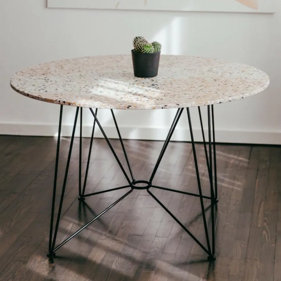 Vom Design bis hin zur Fertigung wird der The Ring Table Esstisch Terrazzo Ø120cm gänzlich in Deutschland hergestellt. Das Gestell aus galvanisiertem und pulverbeschichtetem Stahl ist das Markenzeichen des Tisches. Es wird aus Rohren mit einem Durchmesser von 10 mm hergestellt. Die massive Tischplatte besteht aus Terrazzo. Dabei handelt es sich um einen Werkstoff, der bereits in der Antike verwendet wurde. In das Material sind dekorative, bunte Zuschläge eingearbeitet. So sieht jede Tischplatte ein wenig anders aus. Die Oberfläche ist pflegeleicht und kann mit einem weichen Tuch abgewischt werden. Der The Ring Table Esstisch Terrazzo Ø120cm ist wetterfest und daher für den Innen- und Außenbereich nutzbar. Er eignet sich für das Wohn- und Esszimmer ebenso gut wie für die Terrasse oder den Balkon.