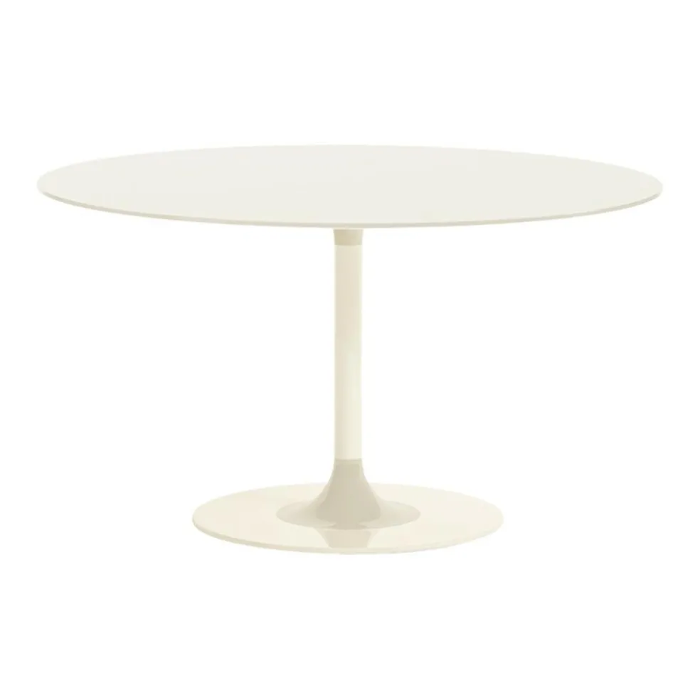 Runde und abgerundete Formen finden sich im Design des kompletten Esstisches wieder. Die kreisrunde Form der sehr flachen Tischplatte wird im ebenso kreisrunden Standfuß in kleinerer Gestalt wieder aufgegriffen. Das Tischbein in filigraner Säulenform geht in schwungvoll konisch zulaufender Form in die Tischplatte beziehungsweise den Standfuß über. Das Gestell mit Tischbein und Standfuß besteht komplett aus lackiertem Stahl. Die Tischplatte im eleganten Look, gearbeitet aus hinterlackiertem und gehärtetem Kristallglas, misst im Durchmesser 130cm. Sechs Personen finden am Tisch bequem Platz. Für große Familien oder alle, deren Gäste gerne spontan zum Essen bleiben, ist der Tisch im Essbereich der gesellige Mittelpunkt. Die Höhe des Esstisches misst 72cm und das Gewicht beträgt solide 115kg. Der Tisch ist in verschiedenen Farbkombinationen erhältlich.