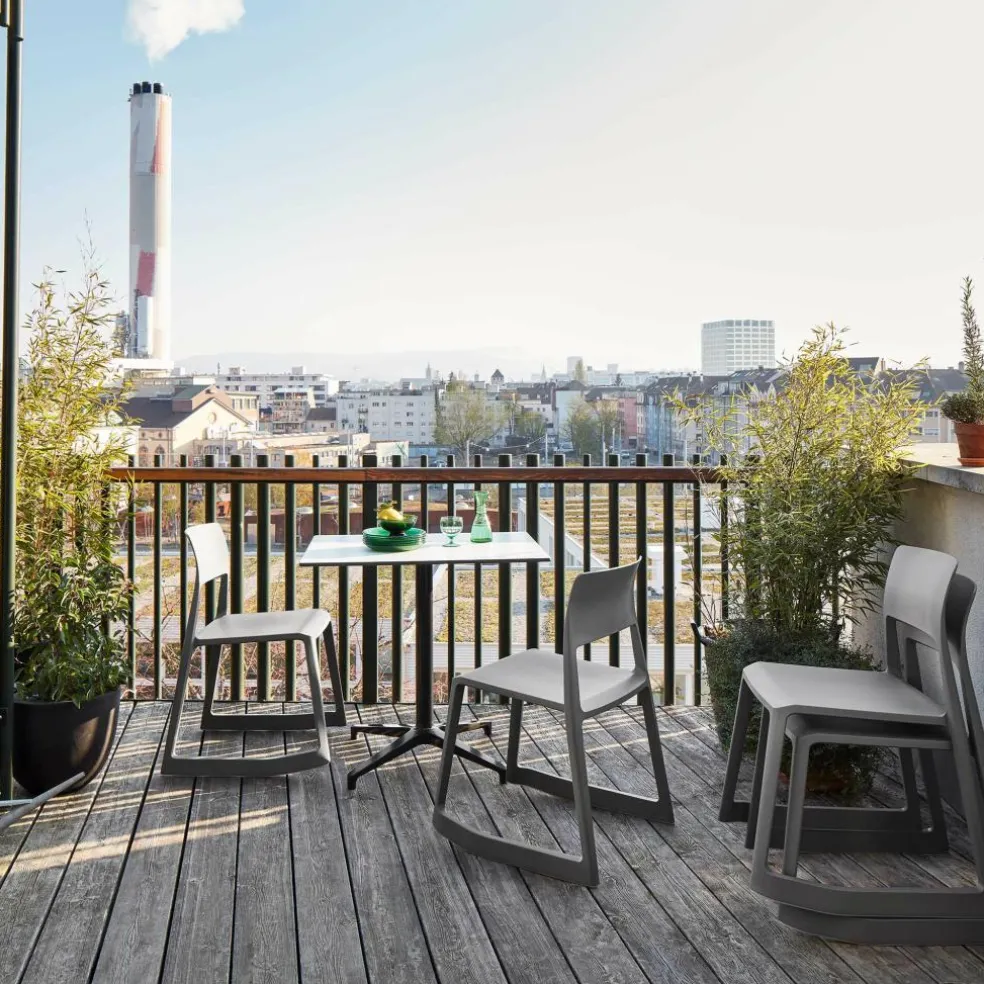 Verlagert man im Tip Ton RE Schaukelstuhl das Körpergewicht leicht nach vorne, kippt er um einige Grad und arretiert in dieser Position. Dadurch werden Becken und Rückgrat aufgerichtet und die Rumpf- und Bauchmuskulatur besser durchblutet. Auch beim Stil hat der Schaukelstuhl einiges zu bieten. Er ist aus einem Guss gefertigt und wirkt mit seinen abgerundeten Kanten harmonisch. Der Tip Ton RE Schaukelstuhl besteht aus recyceltem Polypropylen, das zum Teil aus Verpackungen besteht. Ein Anteil an Glasfasern macht das Modell besonders robust. Außerdem kann der Schaukelstuhl recycelt werden. Ein weiterer Zusatz schützt den Stuhl vor UV-Strahlen. Da man bis zu vier Exemplare übereinanderstapeln kann, lässt er sich platzsparend aufbewahren.