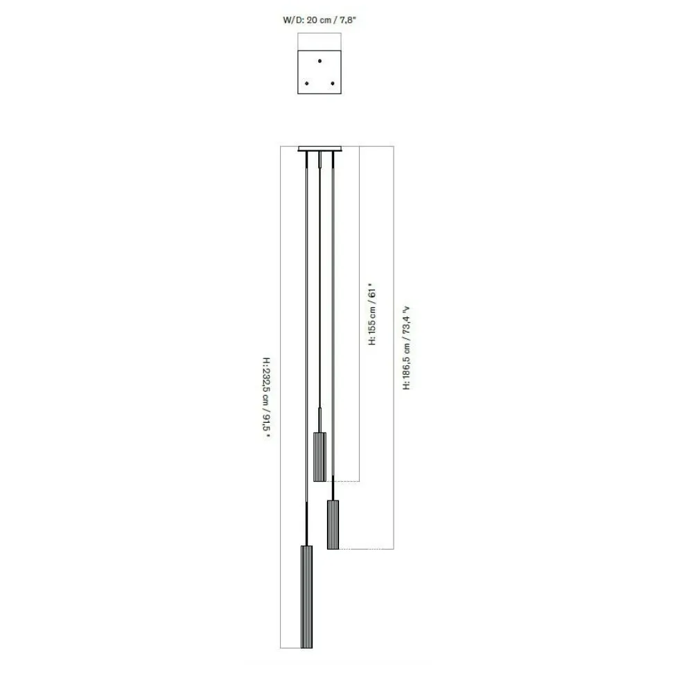 Als funktionale Leuchte und skulpturales Objekt schafft die Tubulaire 3 Pendelleuchte eine außergewöhnliche Verbindung zwischen Kunst und Design. Die Leuchte besteht aus drei schlanken Zylindern aus geriffeltem Aluminium. Sie hängen an einem schwarzen Textilkabel in unterschiedlicher Höhe an einem quadratischen Baldachin senkrecht unter der Decke. Die beiden längeren Leuchten sind 232,5cm und 186,5cm lang, während die kürzeste in der Mitte eine Länge von 155cm aufweist. Die Metallschirme sind in einem aufwändigen Verfahren der Oberflächenveredelung eloxiert und verfügen dadurch über eine warme, bronzierte Messingoberfläche. Der 20cm lange und 20cm breite Baldachin ist aus ABS gefertigt und mit einer langlebigen Pulverbeschichtung versehen. Mit ihrem fokussierten Licht sorgen die Metallschirme für eine direkte Beleuchtung, ob im Wohnbereich oder über einem Schreibtisch.