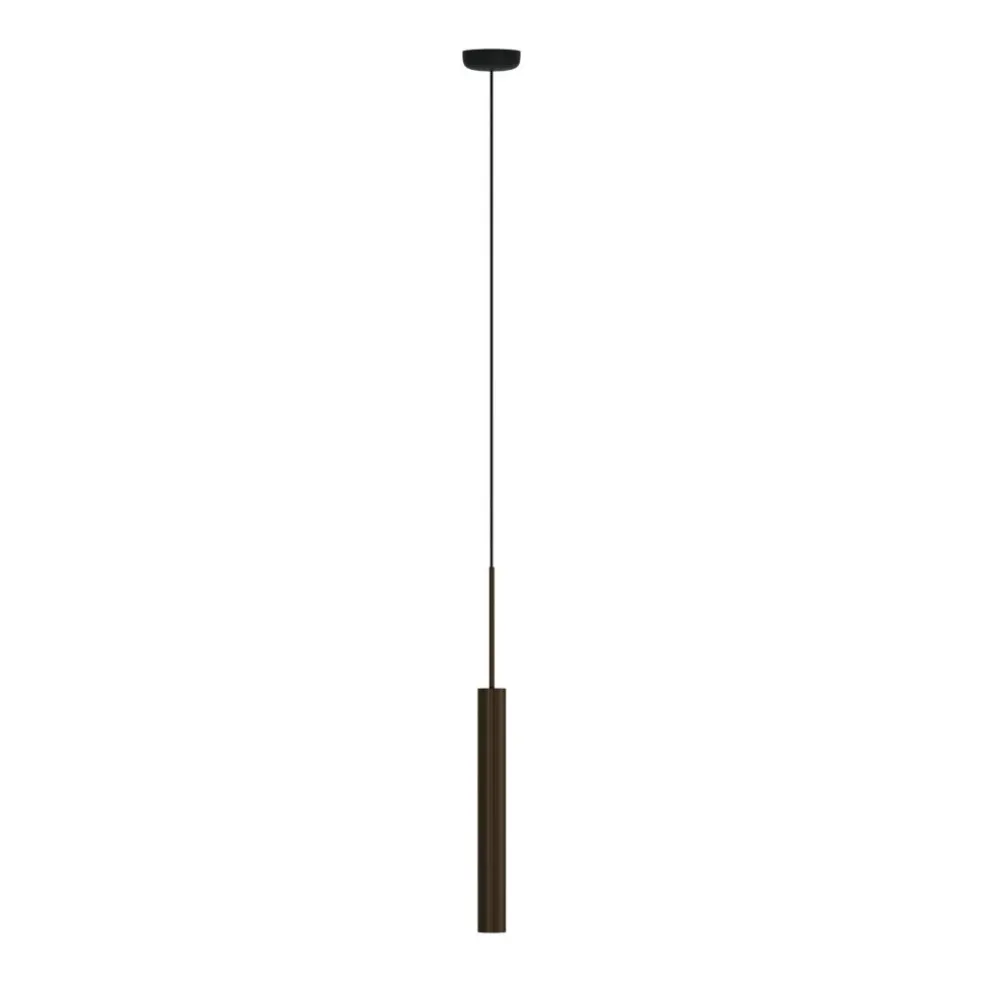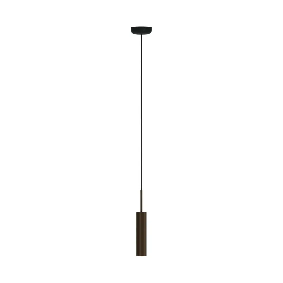 Die Tubulaire Pendelleuchte ist Lichtquelle und skulpturales Objekt zugleich. Trotz aller Schlichtheit zieht sie alle Blicke auf sich. Ihr schmaler, zylinderförmiger Schirm besteht aus stranggepresstem, geriffeltem Aluminium, das durch anodische Oxidation eine bronzierte Messingoberfläche erhält und besonders raffiniert wirkt. Die Röhre ist mit einem schwarzen Textilkabel verbunden, das ein wesentliches Designelement bildet. Zur Anbringung unter der Decke ist ein runder Baldachin aus ABS-Kunststoff mit Pulverbeschichtung vorhanden. Eine punktgenaue, direkte Beleuchtung gewährleistet das fokussierte Licht des Metallschirms. Dazu benötigt wird ein Leuchtmittel mit GU-Fassung mit einer maximalen Leistung von 35 Watt.
