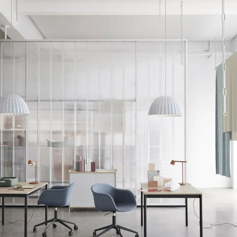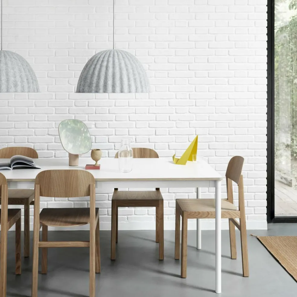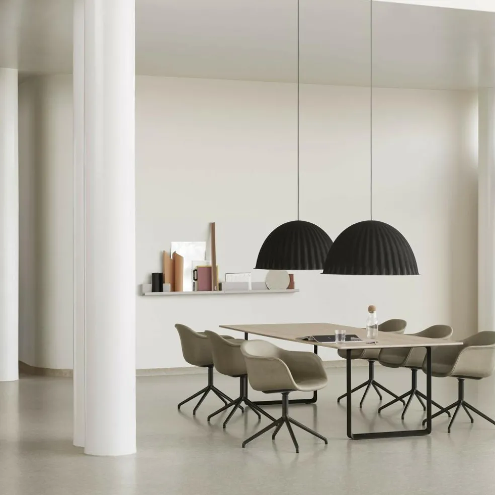 Die Under The Bell Pendelleuchte Ø55cm wurde von Berlin Iskos für die Marke Muuto entworfen. Dahinter stecken die beiden Designer Aleksej Diskos und Boris Berlin, die mit ihren Entwürfen Geschichten erzählen möchten. Wie bei vielen anderen Einrichtungsgegenständen von Berlin und Iskos überrascht auch die Under The Bell Pendelleuchte Ø55cm durch den Einsatz außergewöhnlicher Materialien. Der Schirm mit einem Durchmesser von 55 cm besteht aus Filz und ist aufgrund seines wellenförmigen Designs ein wahrer Hingucker für jeden Raum. Die Leuchte mutet glockenförmig an, was ihr ihren fantasievollen Namen eingebracht hat. Der außergewöhnliche Look entsteht durch ein spezielles Verfahren: Dabei wird eine große PET-Platte erwärmt und in die spezielle Form gepresst. Der breite Schirm verleiht dem Raum ein gemütliches Ambiente. Doch die Under The Bell Pendelleuchte Ø55cm bietet noch einen weiteren Mehrwert: Sie schluckt störende Geräusche und wird aus diesem Grund gerne in Restaurants, Hotels und in öffentlichen Gebäuden eingesetzt. Doch auch in privaten Räumen wie in Wohn- und Esszimmern verbessert die Under The Bell Pendelleuchte Ø55cm die Akustik. Einer der Vorteile des Modells ist, dass sie dank des 5m langen mitgelieferten Kabels beliebig an die Raumhöhe angepasst werden kann.