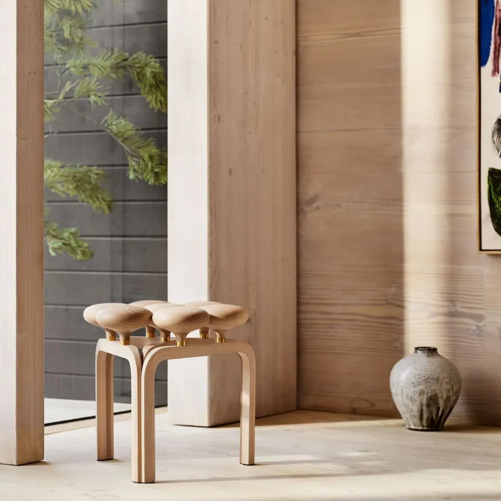 Jørn Utzon, als Dänemarks wohl bekanntester Architekt und weltberühmt für seinen Entwurf des markanten Opernhauses in Sydney, hat mit dem nach ihm benannten Utzon Hocker eine Ikone skandinavischen Designs geschaffen. Das dekorative Sitzmöbel für den Innenbereich ist Ausdruck von Utzons Fähigkeit, komplexe Formen in praktisch nutzbare Gegenstände zu übersetzen. Charakteristisch für den Hocker ist seine Sitzfläche aus sieben runden, kugelförmigen Elementen, die an Schiffspoller erinnern und aus zwei massiven Holzstücken laminiert sind. Zierende, ebenfalls maritim anmutende Messingringe verhindern, dass das Holz reißt. Zugleich sind sie Ausdruck von Detailverliebtheit im Design. Die geölten Massivholzknöpfe sitzen auf einem Untergestell, dessen drei dampfgebogenen Beine aus jeweils 17 Schichten mit 2mm starkem Furnierholz gefertigt und in Form eines Dreiecks angeordnet sind. Alle Lagen sind mit der gleichen Maserung versehen, um ein einheitliches Aussehen zu gewährleisten.