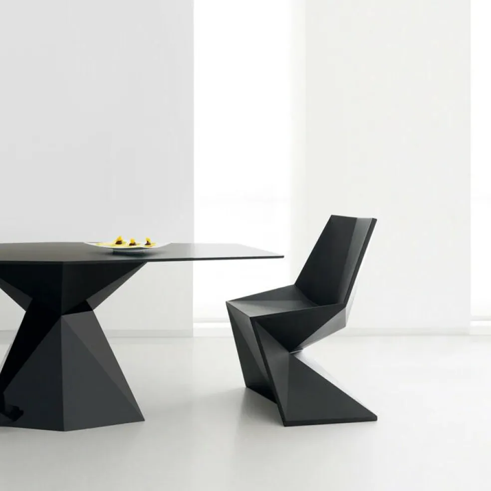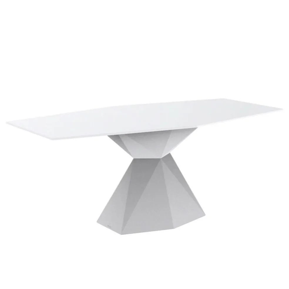 Der Vertex Gartentisch 94x180cm wurde von Karim Rashid für die Marke Vondom entworfen. Das lateinische Wort Vertex bezeichnet einen Scheitelpunkt, an dem verschiedene Richtungen aufeinandertreffen. Dementsprechend ist auch das Design der Vertex-Gartenmöbel-Kollektion von Punkten gekennzeichnet, an denen verschieden geneigte Flächen aufeinandertreffen.