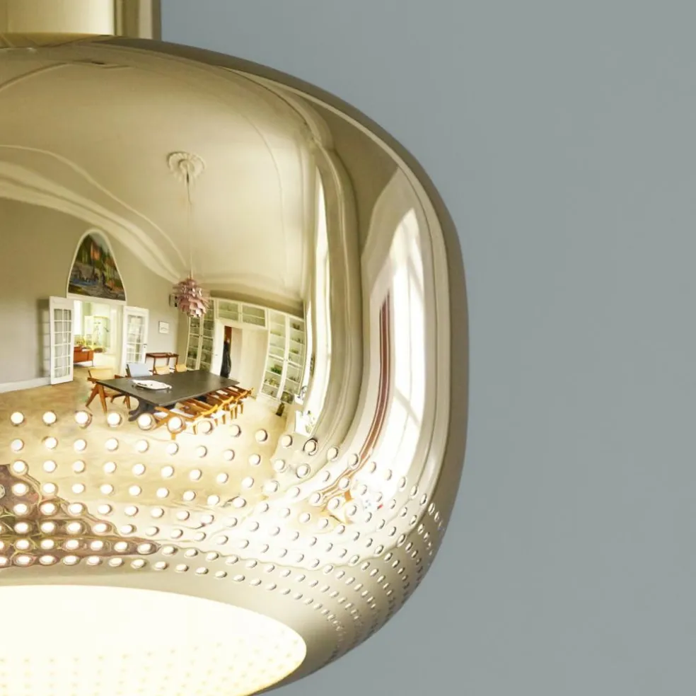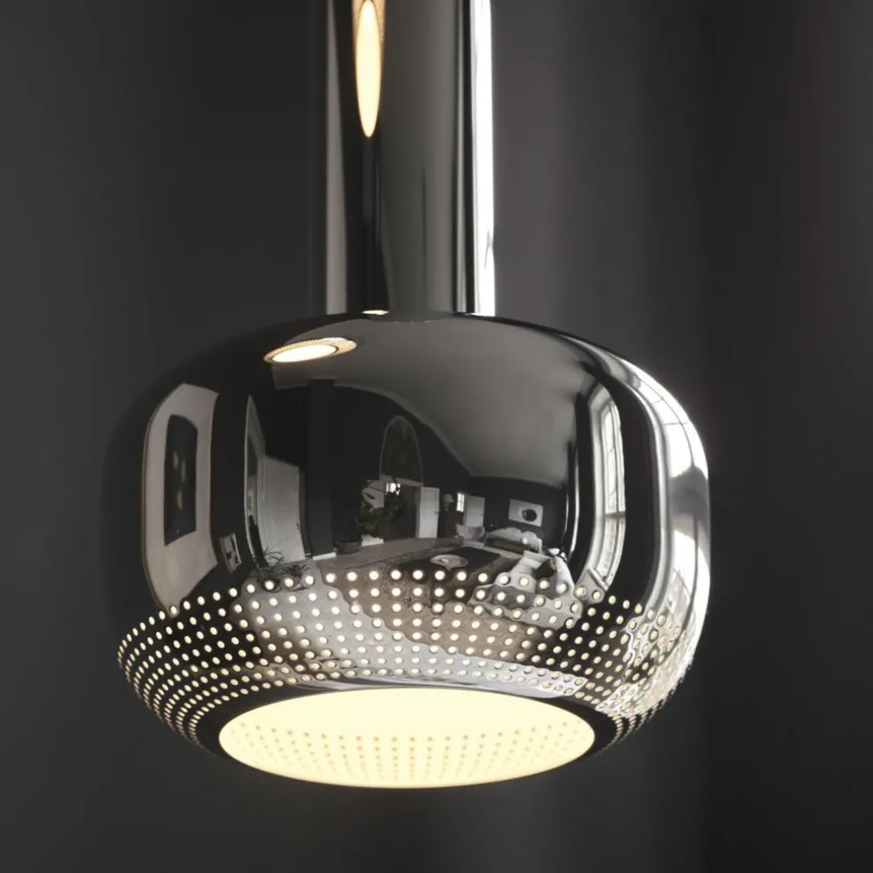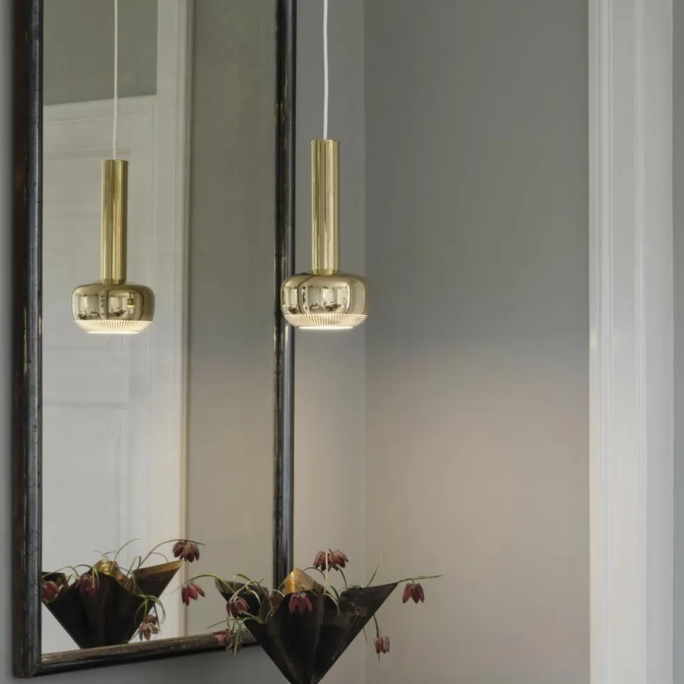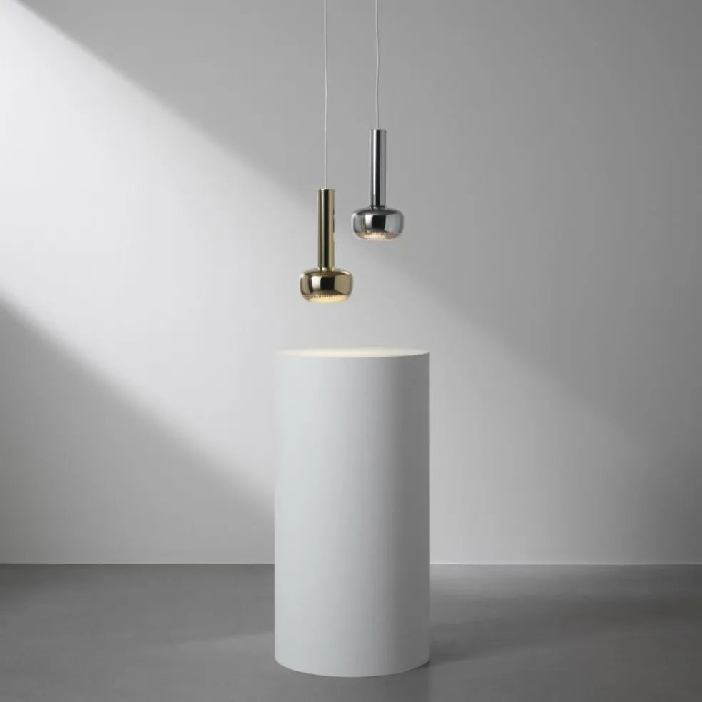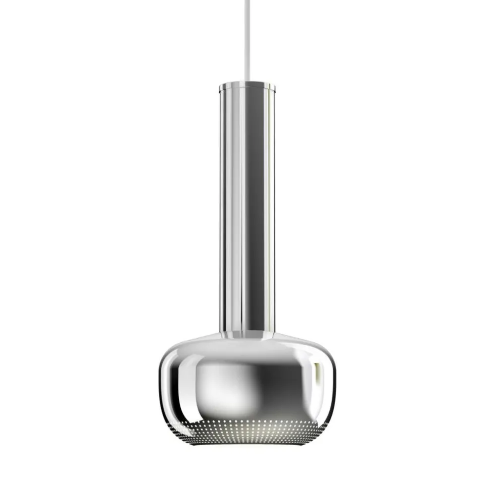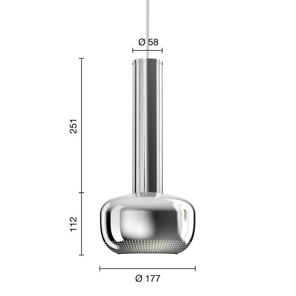 Die Pendelleuchte von Louis Poulsen ist sowohl hochglanzverchromt als auch mit einer polierten Messingoberfläche erhältlich, die eine Patina bildet. Bei einem Gewicht von 1,5kg ist sie 36,3cm hoch. Der Durchmesser ihres Schirms liegt bei 17,7cm.