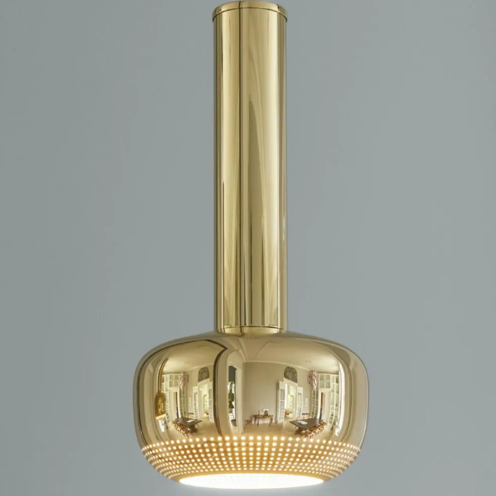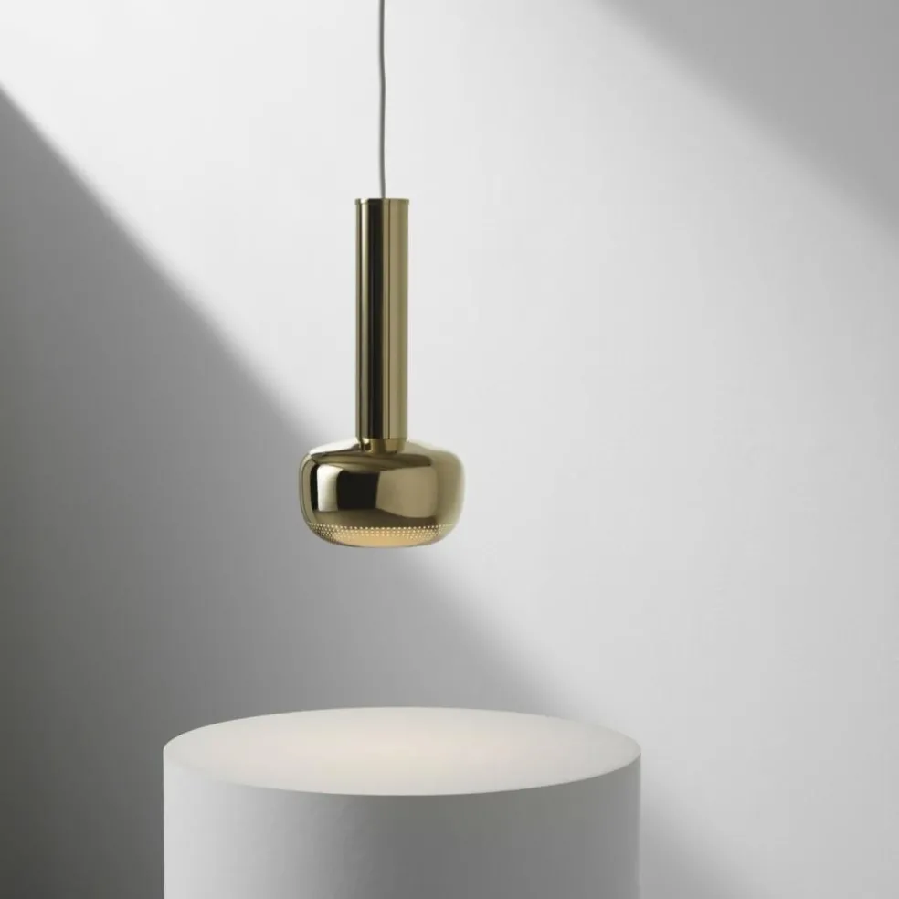 Nicht nur über Bartresen zieht die VL 56 Pendelleuchte allein oder als Gruppe alle Blicke auf sich. Ihr zeitlos modernes Design wertet auch jeden Wohn- und Essbereich auf. Die skulpturale Leuchte besteht aus einem schmalen Zylinder und einem bauchigen Schirm. Sie ist aus Messing gefertigt und besticht durch ein blendfreies Licht, das nach unten gerichtet abgegeben wird. Rund um ihre Schirmöffnung schaffen radiale Perforationen ein schönes, sanftes Lichtmuster, das sich auf dem Schirm und den umgebenden Oberflächen zeigt. Die VL 56 Pendelleuchte benötigt ein Leuchtmittel mit E27-Fassung. Zur Anbringung unter der Decke sind ein Baldachin und ein 400cm langes Textilkabel vorhanden.
