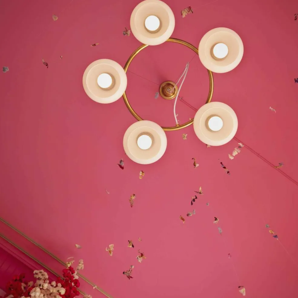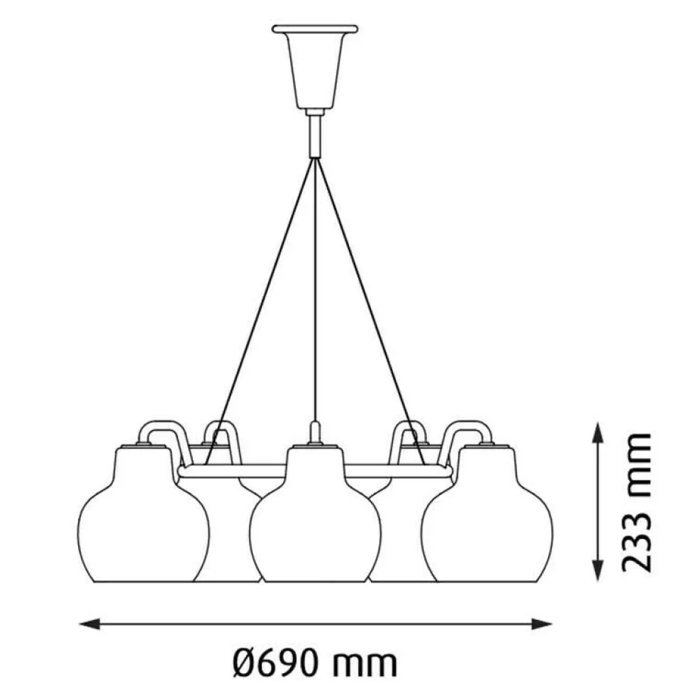 Sowohl in klassischen Interieurs als auch als Bestandteil eines eklektischen Konzeptes schafft es die aus Messing und mundgeblasenem Opalglas gefertigte Pendelleuchte, die Blicke auf sich zu ziehen und ein deutliches Statement für zeitloses und unvergängliches Design zu setzen. Mit einem Durchmesser von 69 cm und einer Höhe von 23,3 cm macht sich diese Leuchte optimal unter hohen Decken.